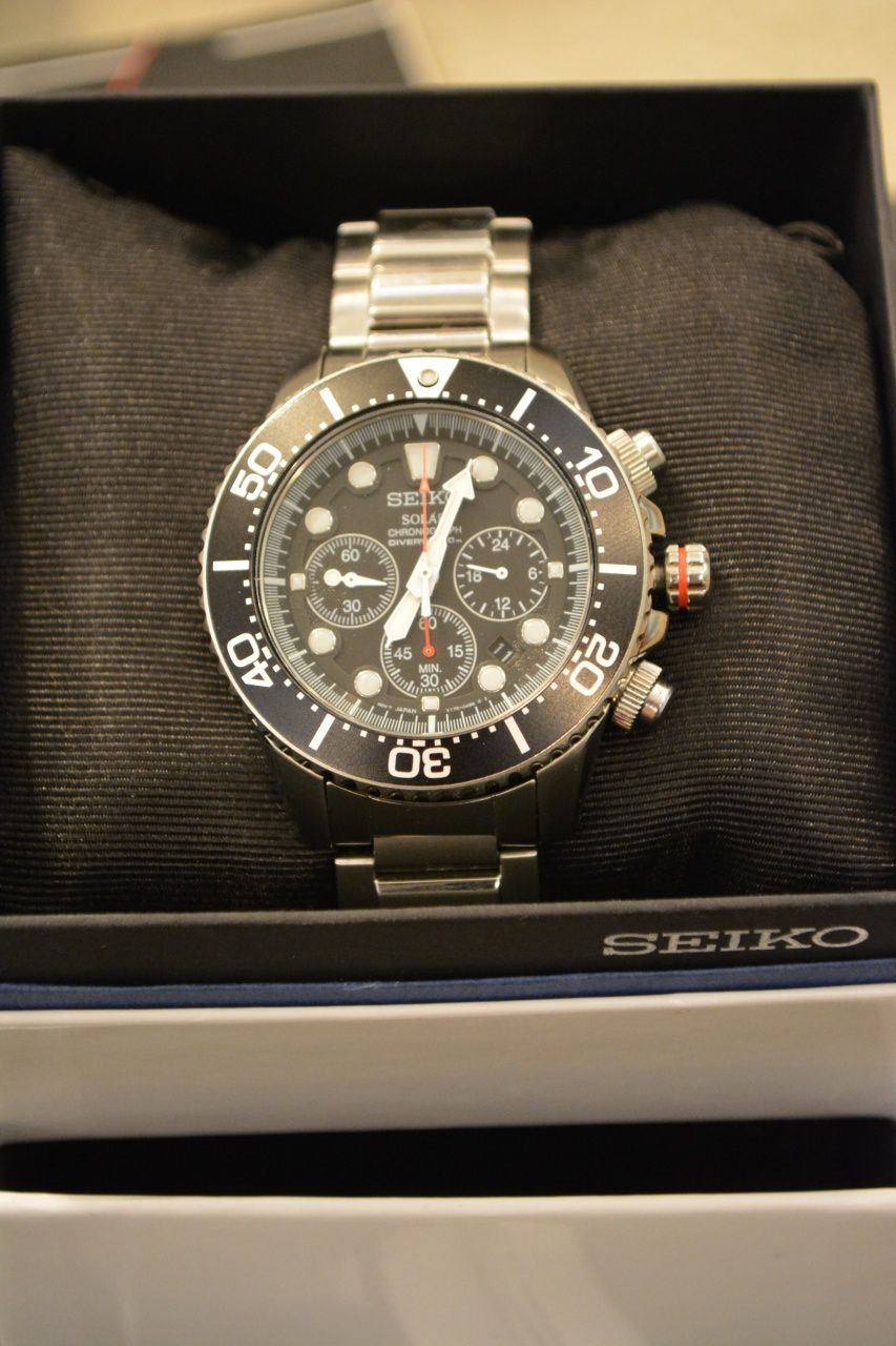 Seiko SSC015P1 - мужские кварцевые часы. Корпус этих часов крупного размера (43 мм.) и выполнен из нержавеющей стали. Модель SSC015P1 имеет стекло хардлекс, стальной браслет металлического цвета, чёрный циферблат. Водоустойчивость: 200 метров. Дополнительные функции и особенности: дата, хронограф, питание от солнца. Полная заводская комплектация Seiko. Часы на гарантии в идеальном состоянии.