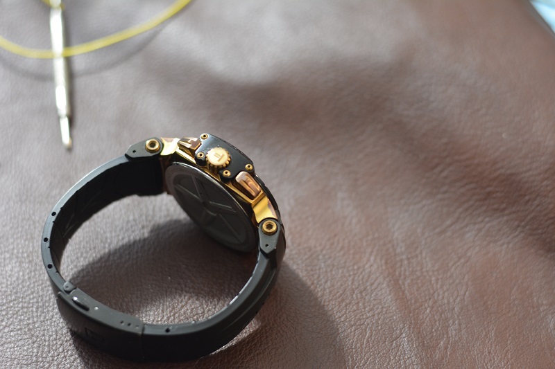 между ремешком и часами прикручены немаленькими шестигранными болтами,смотрится очень красиво, но надо признаться что когда держишь часы в руке эти фрагменты скрипят, когда часы на запястье ни каких шумов и скрипов нет. На задней крышке изображены спицы колеса, ведь T-Race это динамичный дизайн с множеством деталей из мира мотоспорта.