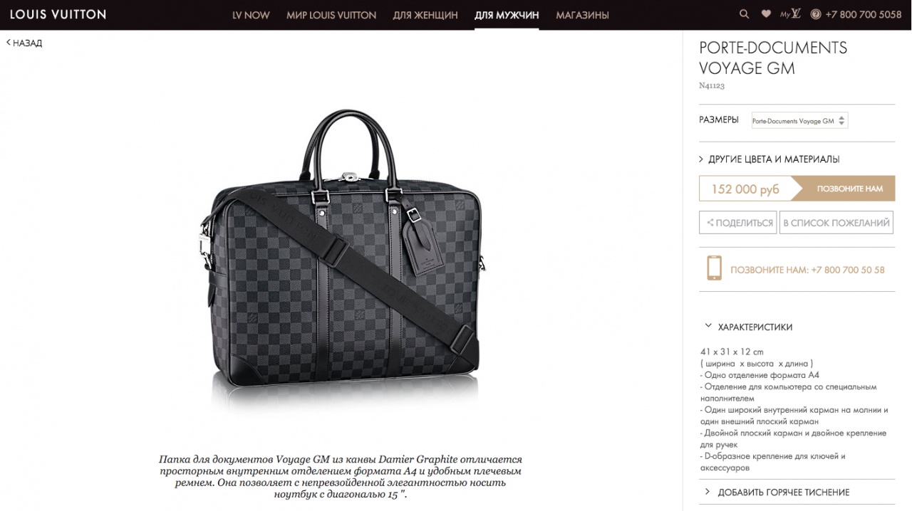 "Сумка Porte Documents Voyage является современной интерпретацией знаменитого дизайна Louis Vuitton. Она прекрасно подойдет деловому человеку благодаря своей легкости и вместительности. Сумка позволяет носить документы А4, 15" ноутбук и множество других повседневных вещей с непревзойденной элегантностью."