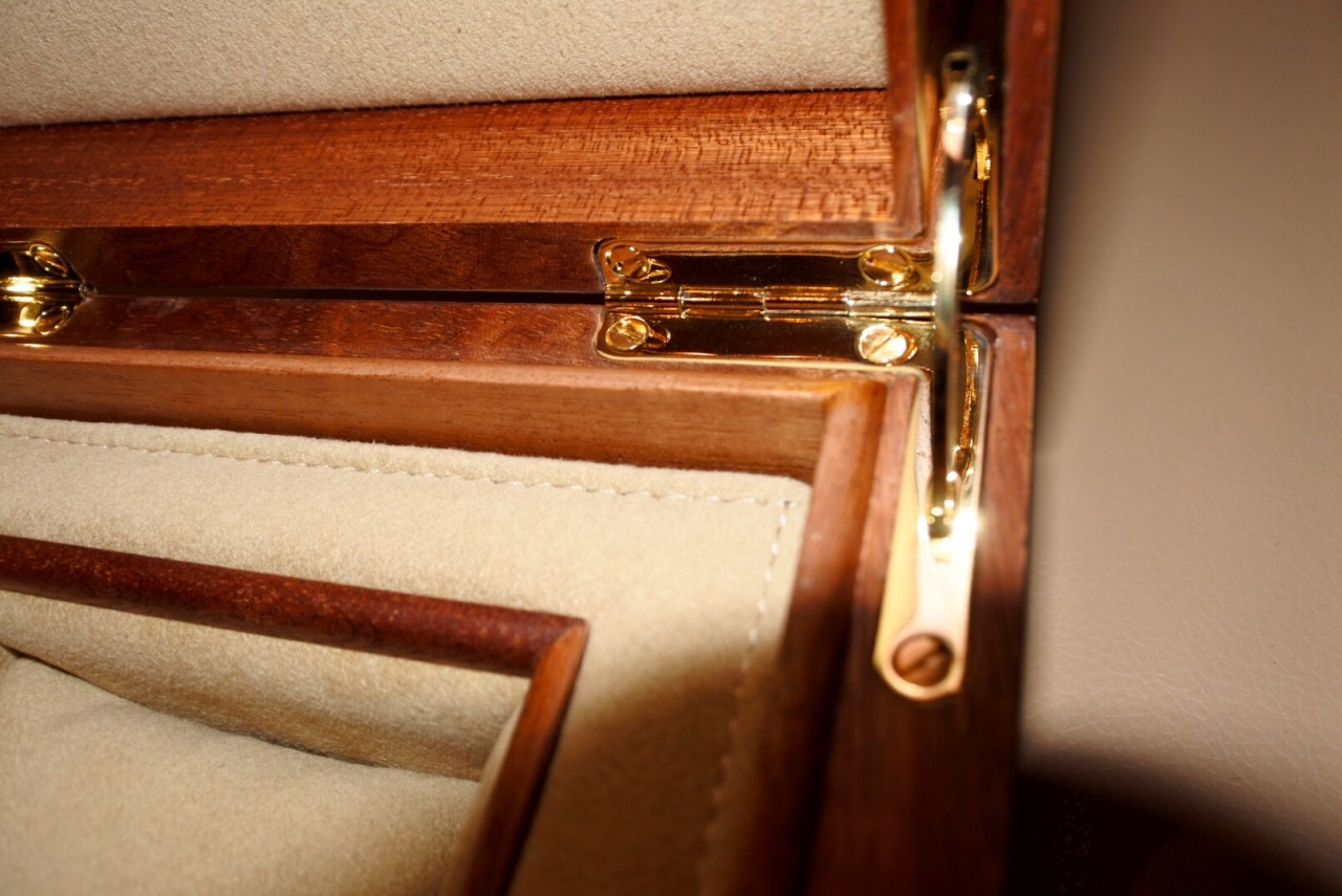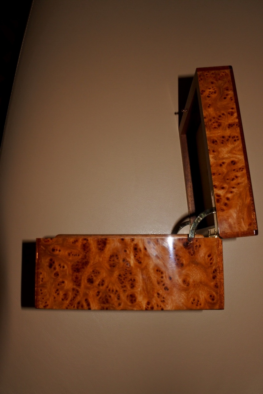Полный комплект всех частей - картонная упаковка, отделения под документы, сам деревянный кейс, подушечка, запирающие устройство