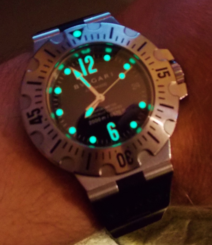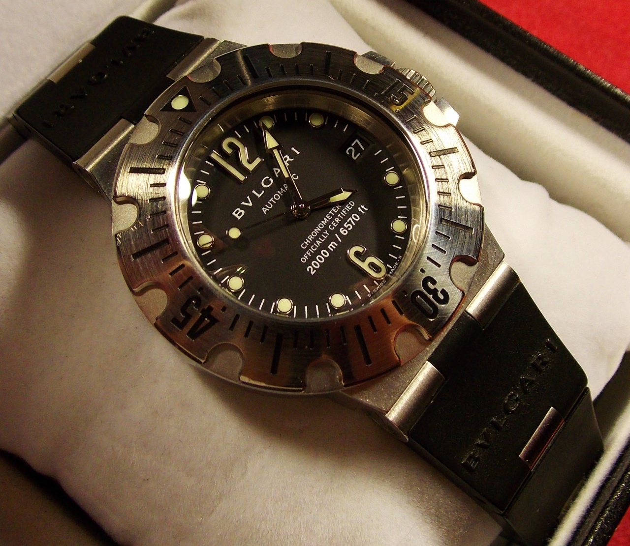 Bvlgari Diagono Professional Aqua Scuba Diving 2000. Механика. Швейцария. Модель 2005г. Корпус сталь (не алюминий, как в некоторых моделях Вулгари Диагоно!) , диаметр 42,6мм, вес 153гр., стекло сапфир, дайверские, глубинные - водозащита 2000 метров, механика/автомат калибр ЕТА 2892-А2 модифицированный, каучук в хорошем состоянии, как и часы в целом, на ходу, все функционирует. Часы/минуты/секунды/дата. В онлайн цены от $5000 до $6000, в оффлайне в России ещё выше.