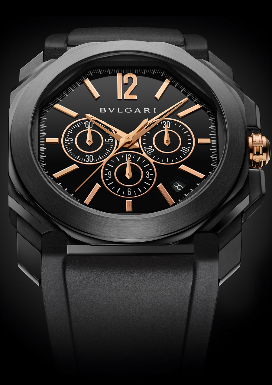 Новая модель Octo Velocissimo Ultranero от производителя швейцарских часов Bvlgari имеет корпус, выполненный в октогональной форме, изготовленный из нержавеющей стали с черным покрытием, диаметром 41,0 мм. Защищенная шаровидная заводная головка, выполненная из 18-каратного розового золота, расположена на 3 часах, продолговатые пушеры хронографа - на 2 и 4 часах. Сапфировое стекло установлено на передней стороне часового корпуса и на его завинчивающейся задней крышке. Циферблат черного цвета, с накладными золотыми арабскими цифрами, часовыми индексами и стрелками (в том числе часовая и минутная стрелки - скелетонизированные). Модель оснащена швейцарским автоматическим механизмом El Primero от Zenith, с балансовой частотой 36000 полуколебаний в час (5 гц), с функциями индикации часов, минут (посредством соответствующих центральных стрелок), секунд (на соответствующем малом боковом циферблате, расположенном на 9 часах), даты (посредством соответствующего цифрового указателя в апертуре, расположенной между 4 и 5 часами), а также с хронографом (центральная секундная стрелка, круглый аналоговый 30-минутный счетчик, расположенный на 3 часах и круглый аналоговый 12-часовый счетчик, расположенный на 6 часах).