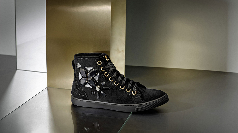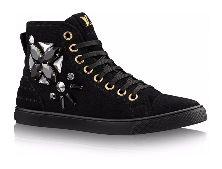 Роскошные высокие сникеры из натуральной замши черного цвета, вручную декорированные крупными кристаллами в форме цветка из узора Monogram Louis Vuitton.