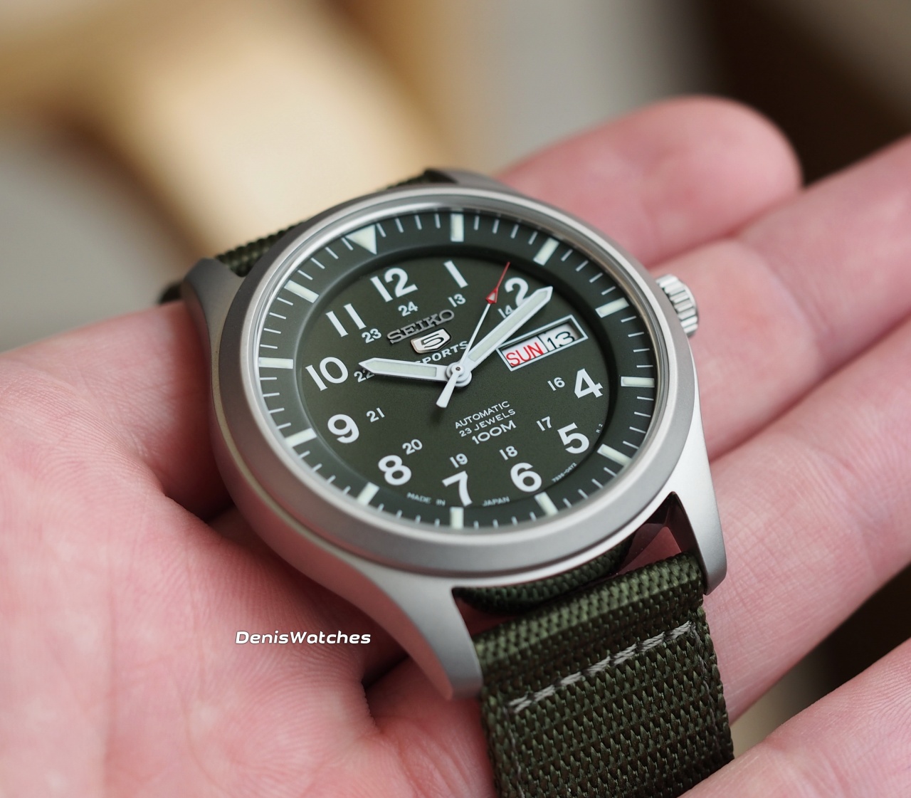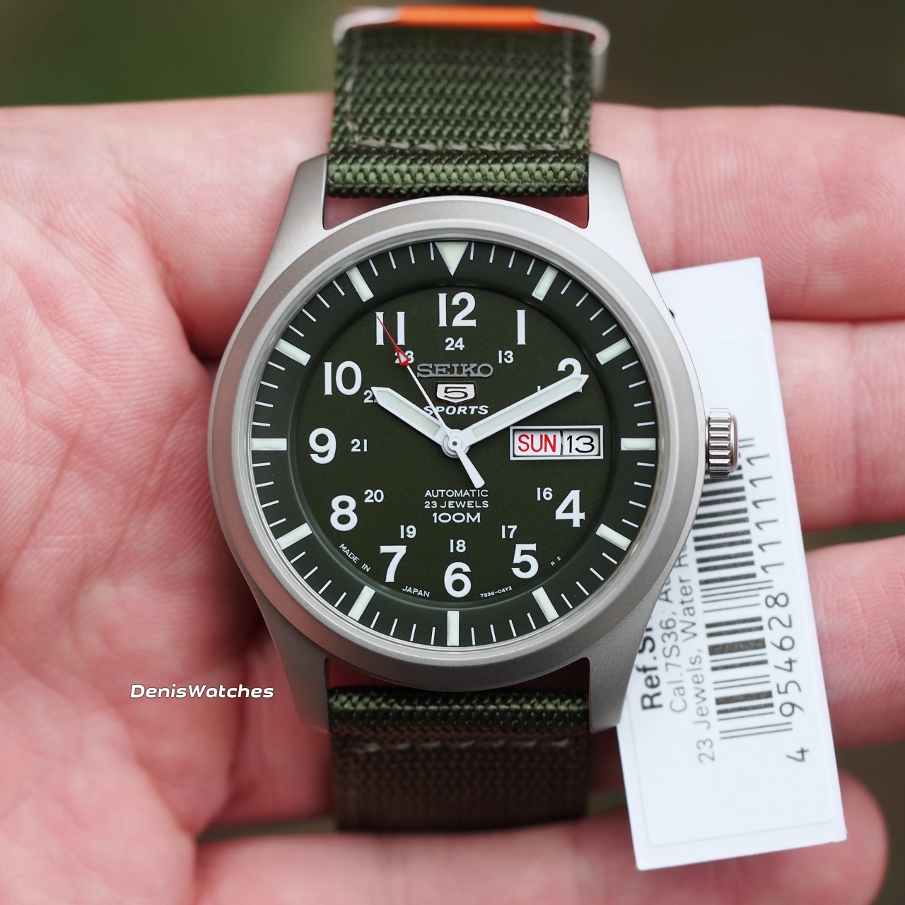 Недорогой зеленый автомат в стиле Military на удобном нейлоновом ремне из серии Seiko 5 Sports