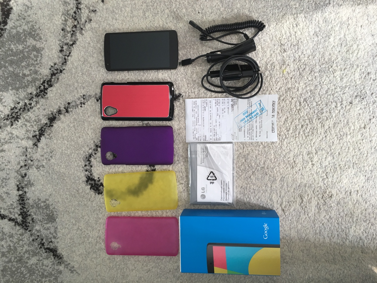 Продам смартфон LG Nexus 5, цвет черный, память 16 Гб, модель D821 ростест. Телефон произведен в октябре 2014, куплен в декабре 2014 в Мвидео, чек имеется. Полный комплект: телефон, оригинальные зарядка и кабель, мукулатура, скрепка, коробка. Дополнительно отдам автомобильную зарядку и 4 ярких чехла. Телефон эксплуатировался бережно, никаких сколов и трещин, есть лишь мелкие царапки, заметные только под определенным углом. Ремонтов не было, все работает исправно.