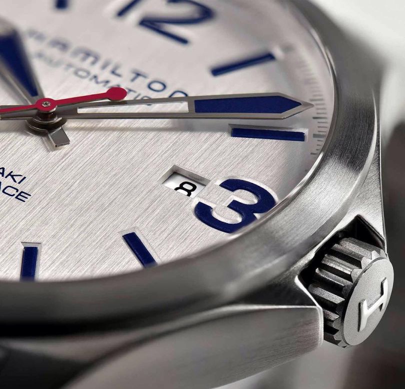 Круглый сатинированный корпус новинки, изготовленный из нержавеющей стали, диаметром 42,0 мм, водонепроницаемый до 50 метров, с 20-миллиметровым расстоянием между ушками. На торце защищенной рифленой заводной головки, расположенной на 3 часах, выгравировано изображение логотипа бренда Hamilton. Сапфировое стекло установлено на передней стороне часового корпуса и на его завинчивающейся задней крышке. Алюминиевый циферблат серого цвета с вертикальным сатинированием, с накладными арабскими цифрами и продолговатыми часовыми индексами, покрытыми, как и скелетонизированные часовая и минутная стрелки, люминесцентным составом синего цвета. Минутная разметка нанесена в виде черных напечатанных маркеров на периферии циферблата. Секундная стрелка выполнена в контрастном красном цвете. Модель оснащена швейцарским автоматическим механизмом Hamilton H10 (базовый калибр ETA Powermatic), на 25 камнях, с балансовой частотой 21600 полуколебаний в час (3 гц), 80-часовым запасом хода, функциями индикации часов, минут, секунд (посредством соответствующих центральных стрелок) и даты (посредством соответствующего цифрового указателя в прямоугольной апертуре, расположенной на 3 часах).