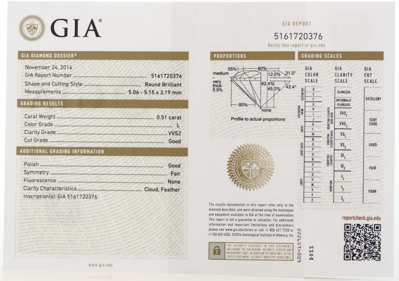 Характеристики указаны на основе сертификата GIA #5161720376 от 24.11.2014, прилагающегося к изделию.