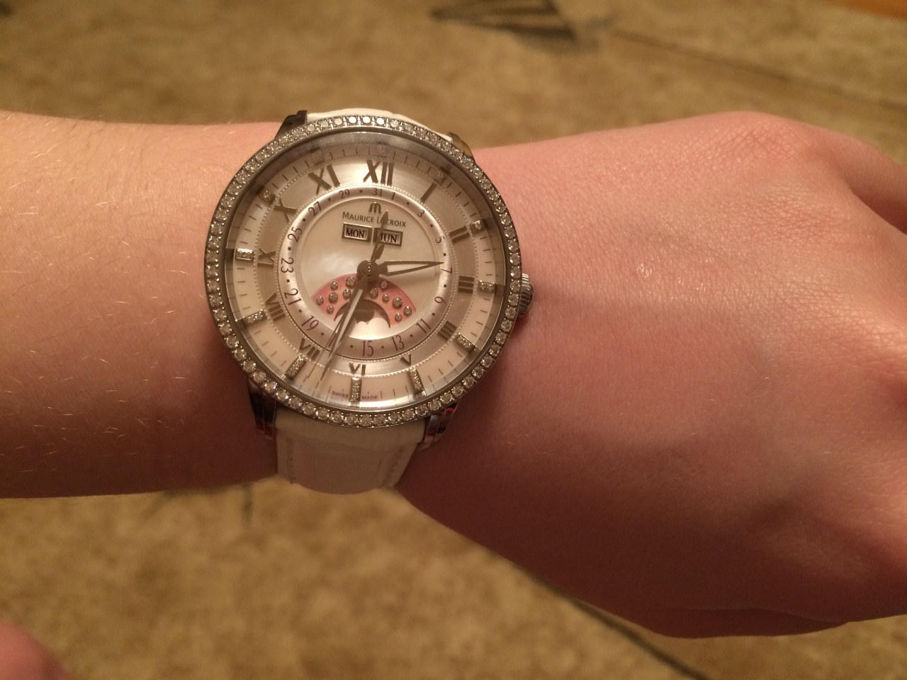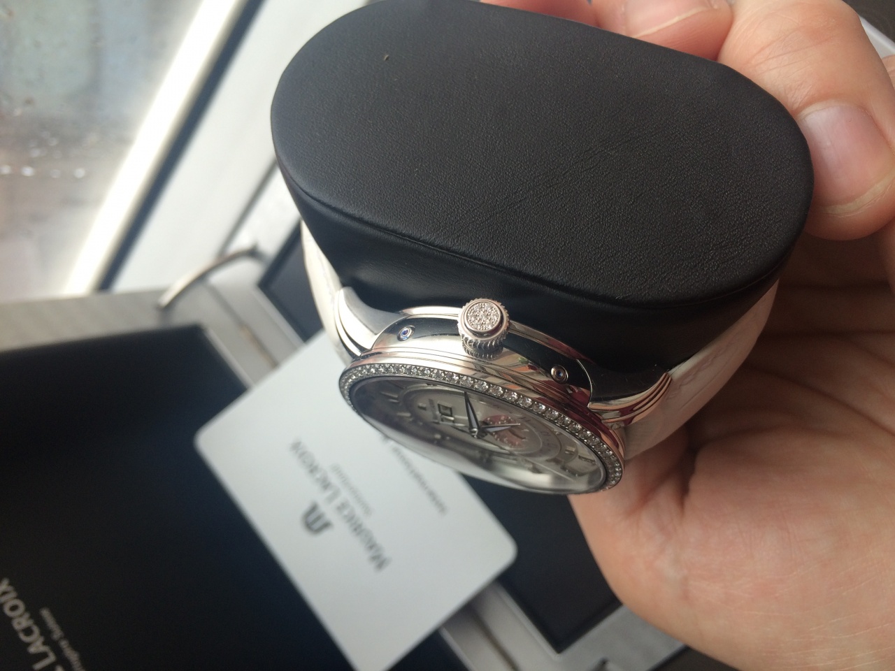 Продам Maurice Lacroix в массивном стальном корпусе диаметром 41мм, инкрустированном 67 бриллиантами(1.12 карат) трёх-рядный циферблат из серебра и перламутра. Над аппертурой фазы Луны дизайнеры разместили звездное небо из драгоценной россыпи бриллиантов. Для соблюдения оптического равновесия шкалы всех трёх циферблатов децентрализованы относительно друг друга. Сердце часов - автоматический калибр на 25 камнях. Полюбоваться которыми можно сквозь заднюю прозрачную крышку и скелетизированный ротор.