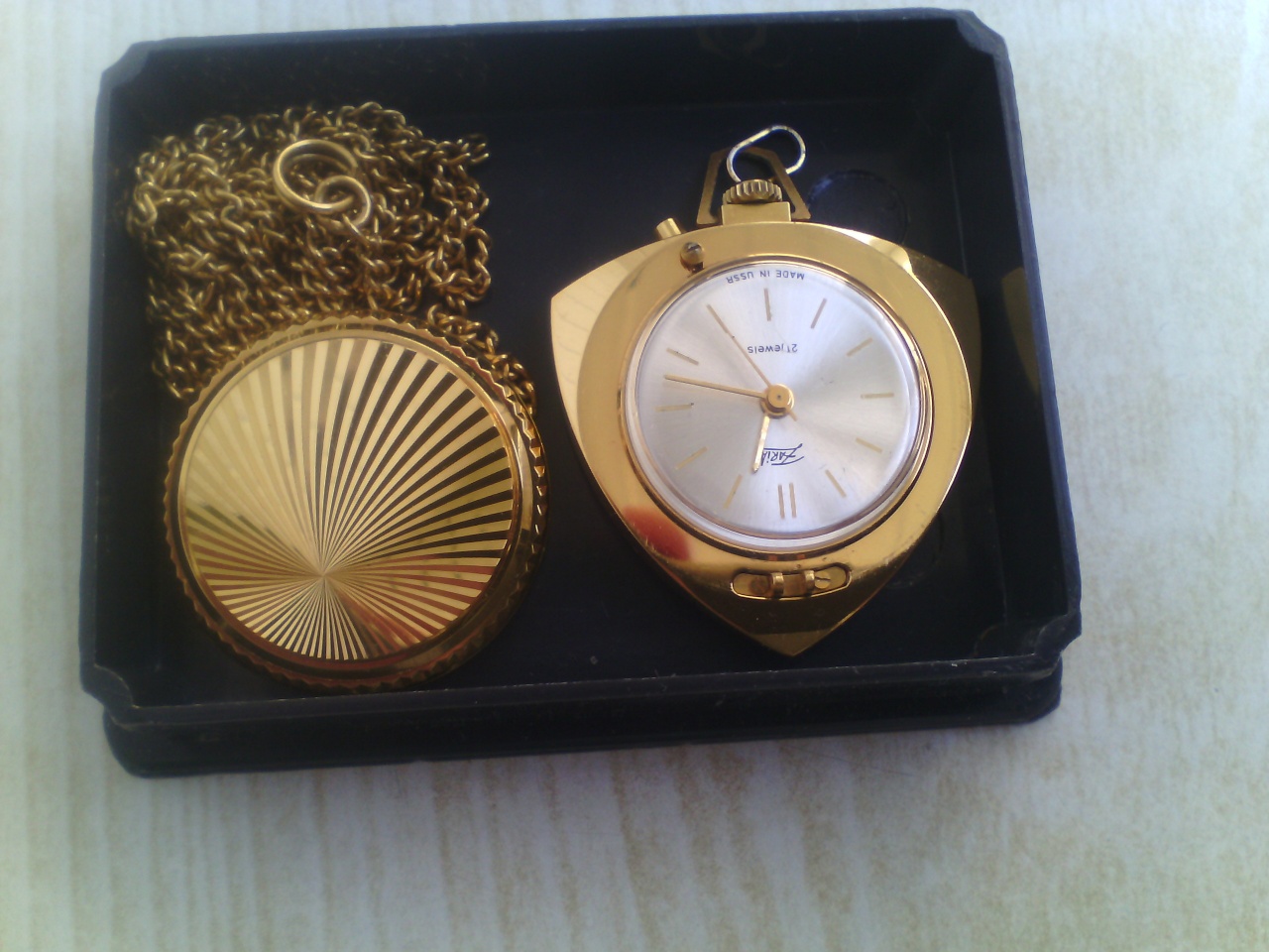 Помогите, пожалуйста, определить текущую стоимость часов в таком состоянии: корпус и крышка циферблата - состояние очень хорошее, задняя крышка - без царапин, но есть небольшая потертость (лежали в пластиковой коробке), присутствует маркировка Au без цифры на боковой грани. Часы заводятся и идут, за сутки заметного отставания нет. Цепочка требует восстановления. Похоже, что нет пружинки? которая крепит крышку, закрывающую циферблат, к корпусу часов.