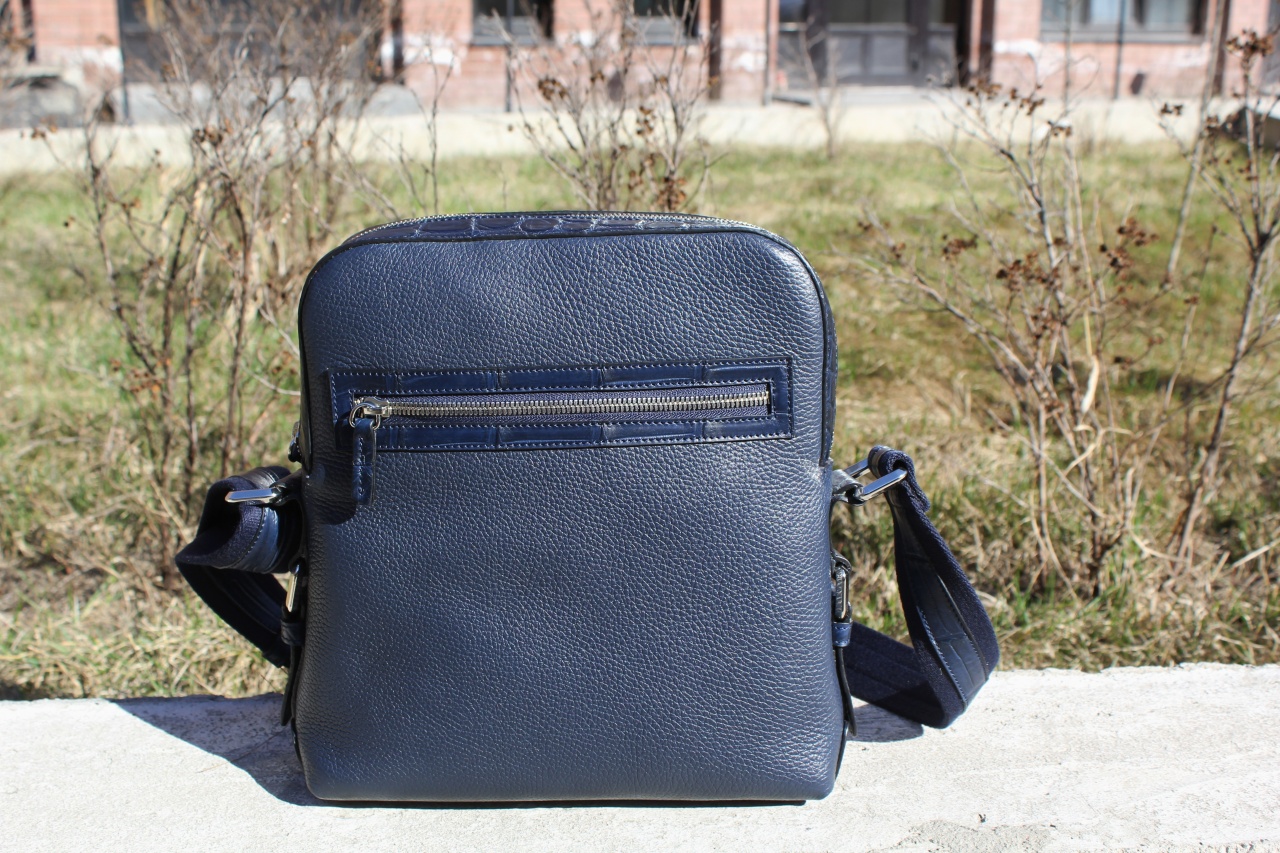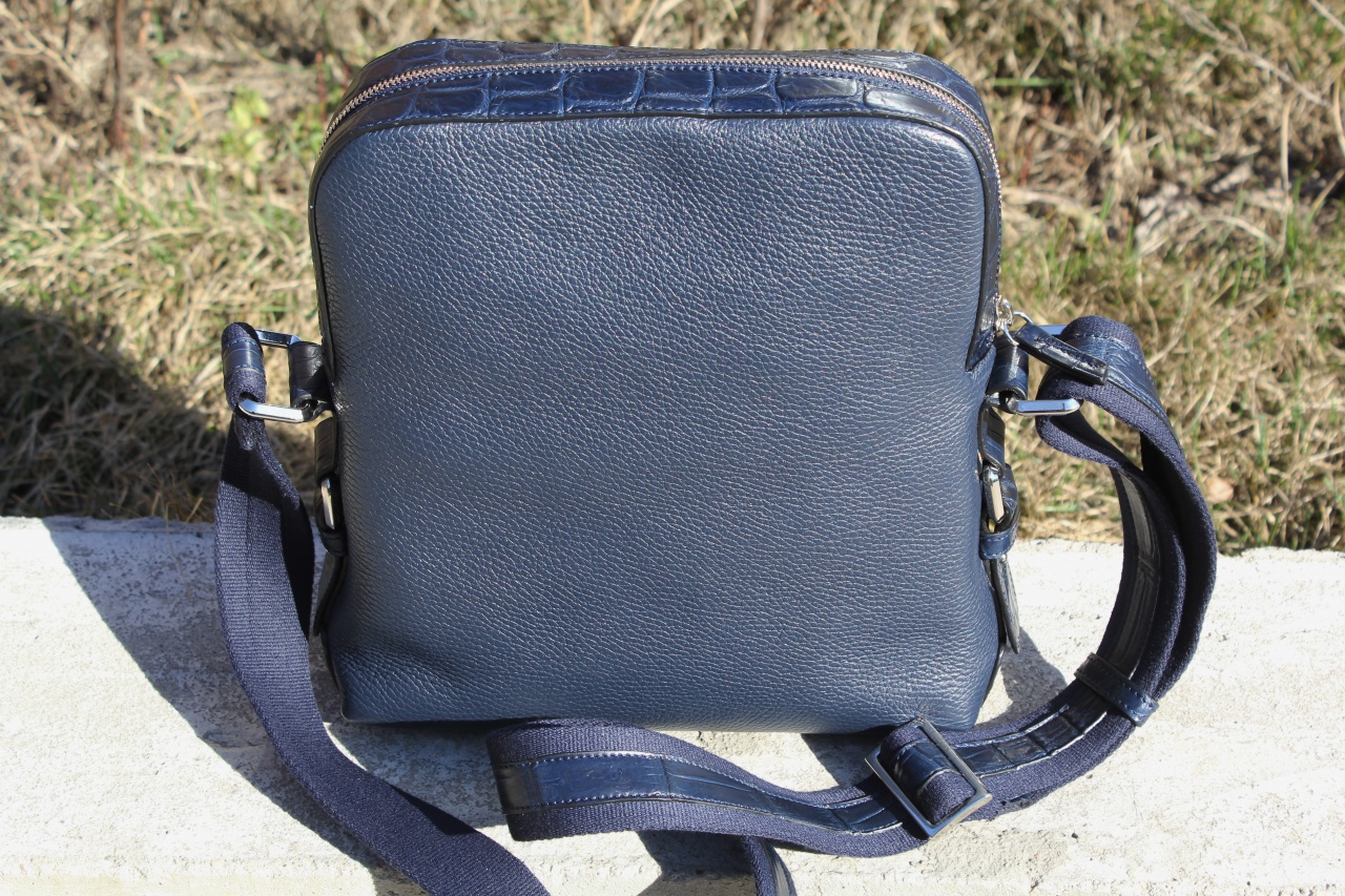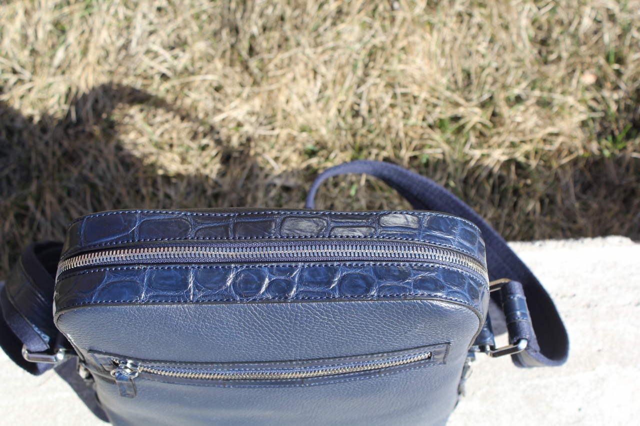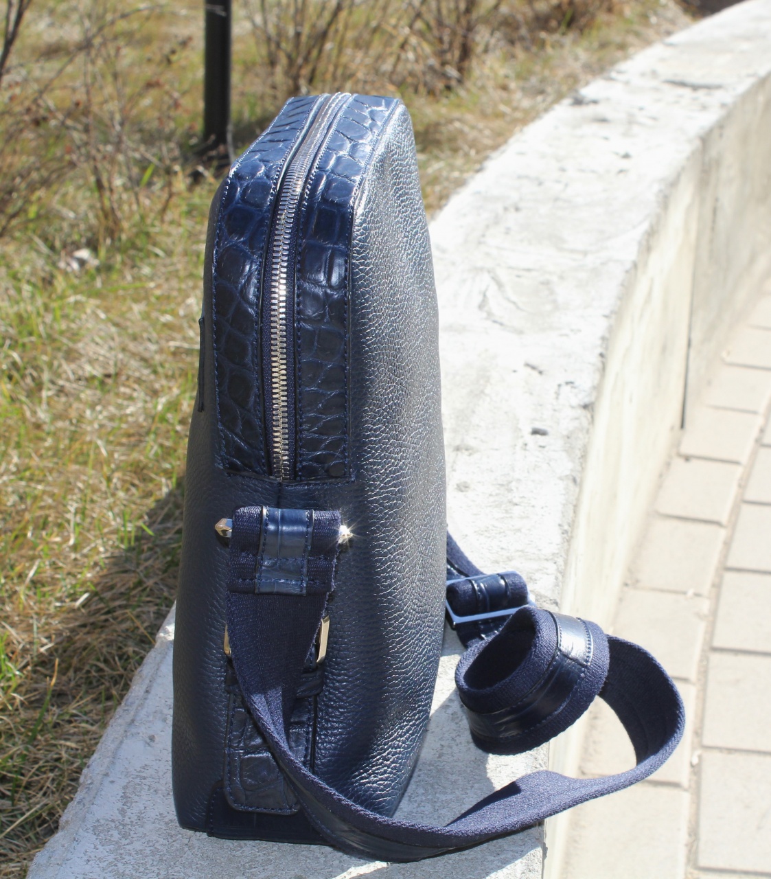 Синяя мужская сумка на плечо из оленьей кожи и крокодила. Италия