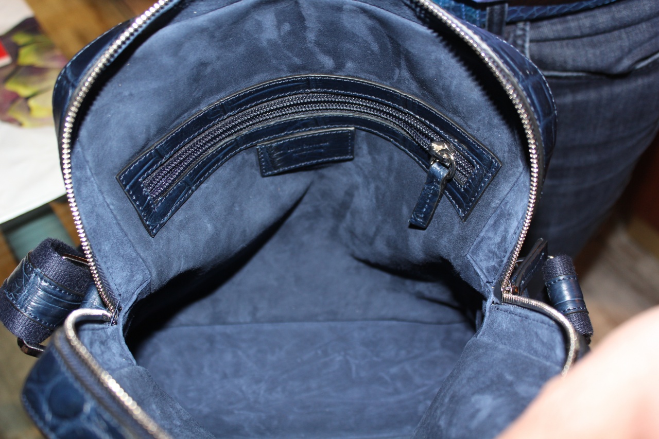 Внутри сумка изготовлена из мелковорсистой замши синего цвета, и имеет одно большое отделение для переноски документов и прочих вещей, и дополнительное отделение на молнии.