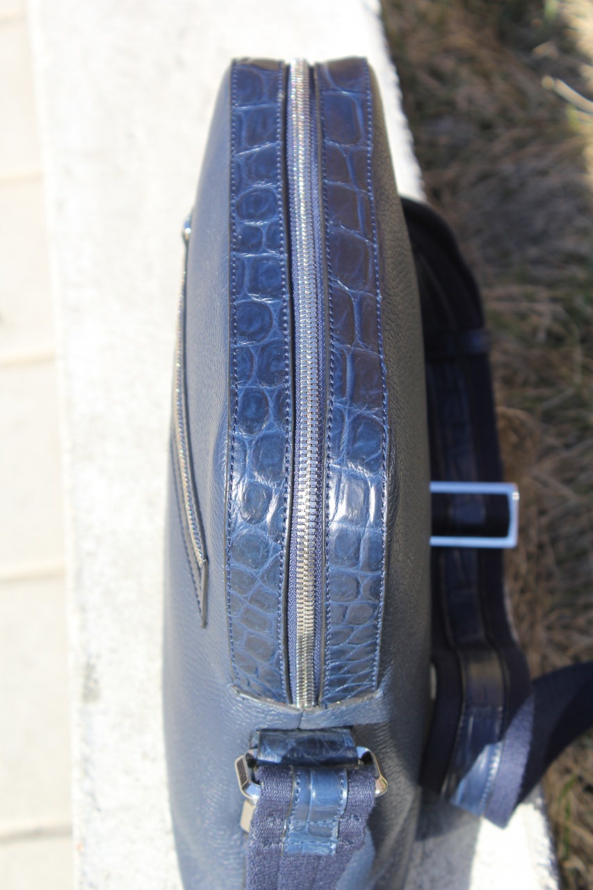 Сумка застегивается на металлические молнии с бегунками из кожи крокодила и имеет снаружи отделение для небольших документов.