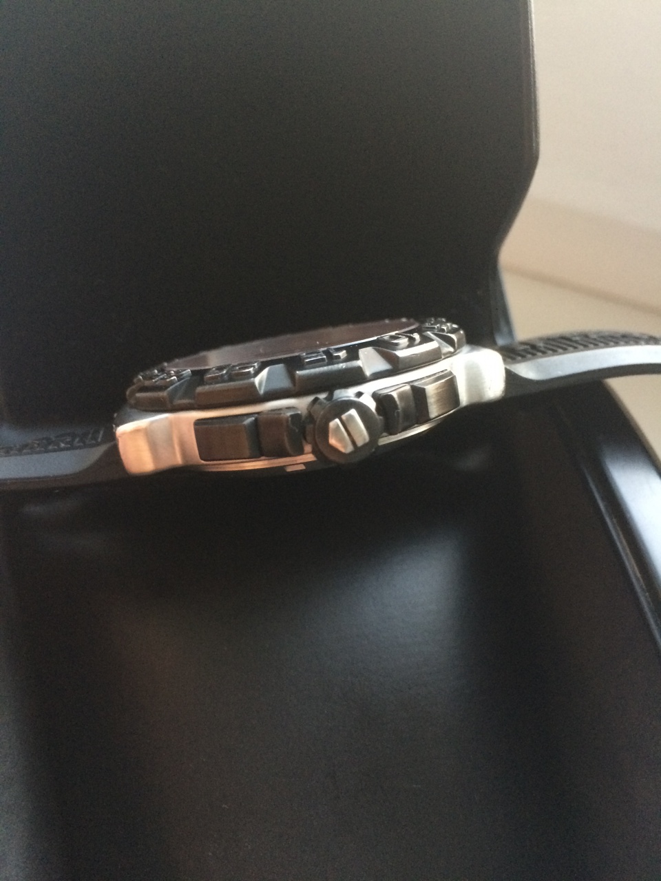 Состояние в целом хорошее - все функции рабочие, ход точный. На корпусе есть царапины. Стекло чистое, без царапин. Каучуковый браслет на любое запястье. В комплекте только коробка.