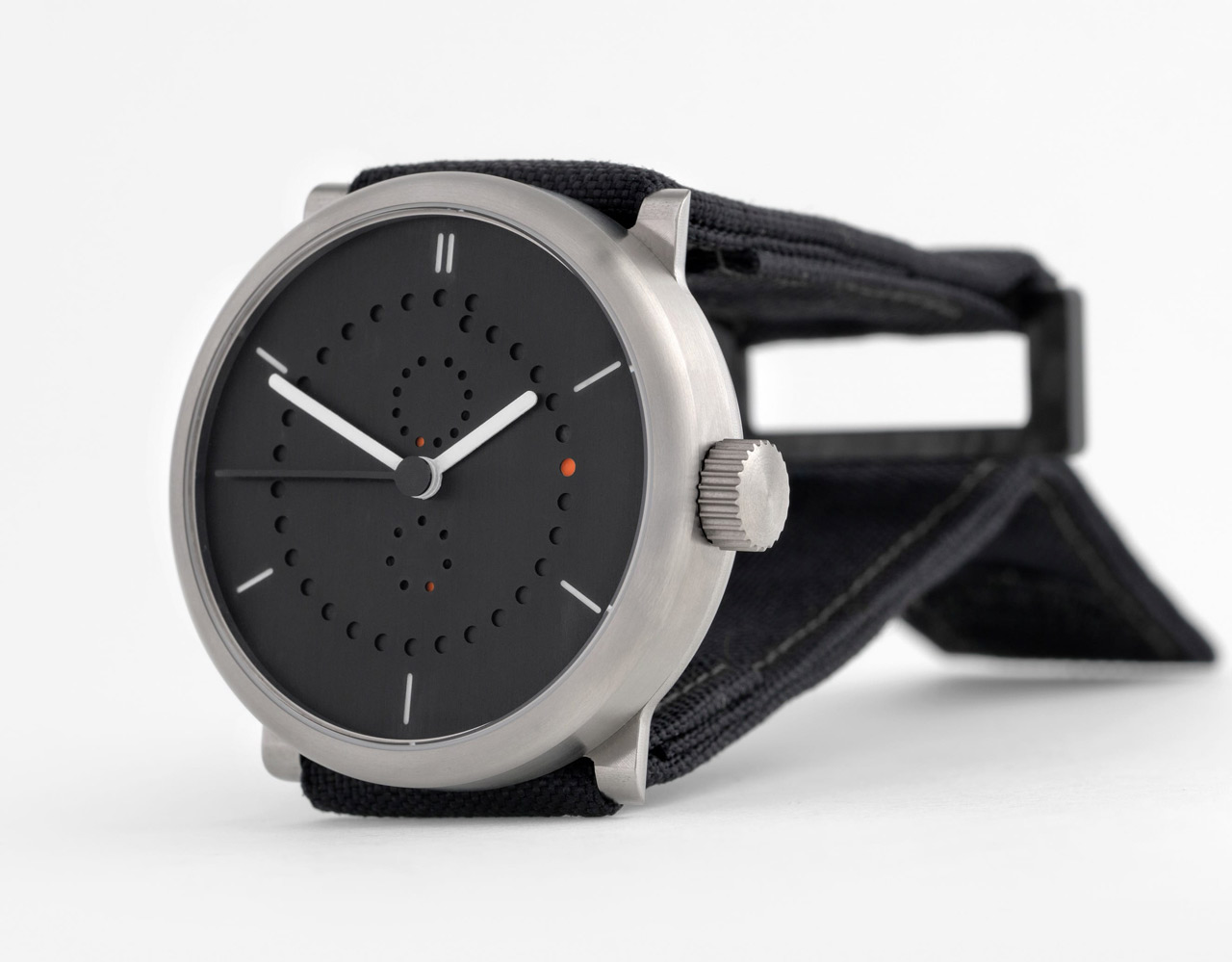 Новинка имеет круглый корпус, диаметром 42,0 или 39,0 мм, водонепроницаемый до 50 метров. Рифленая заводная головка расположена на 3 часах. Матово-черный циферблат защищает сапфировое стекло с антибликовым покрытием. Часовая и минутная стрелки белого цвета, а секундная - черного. Модель оснащена швейцарским автоматическим механизмом ETA 2824-2, модифицированным Людвигом Охслином, с балансовой частотой 28800 полуколебаний в час (4 гц), 38-часовым запасом хода, функциями индикации часов, минут, секунд (посредством соответствующих центральных стрелок), даты (посредством оранжевой точки, "передвигающейся" по часовой стрелке на перфорированном центральном "циферблате", состоящем из 31 микроапертуры), дня недели (посредством оранжевой точки, "передвигающейся" против часовой стрелки на перфорированном малом боковом "циферблате", расположенном на 6 часах, и состоящем из семи микроапертур), месяца (посредством оранжевой точки, "передвигающейся" против часовой стрелки на перфорированном малом боковом "циферблате", расположенном на 12 часах, и состоящем из двенадцати микроапертур).
