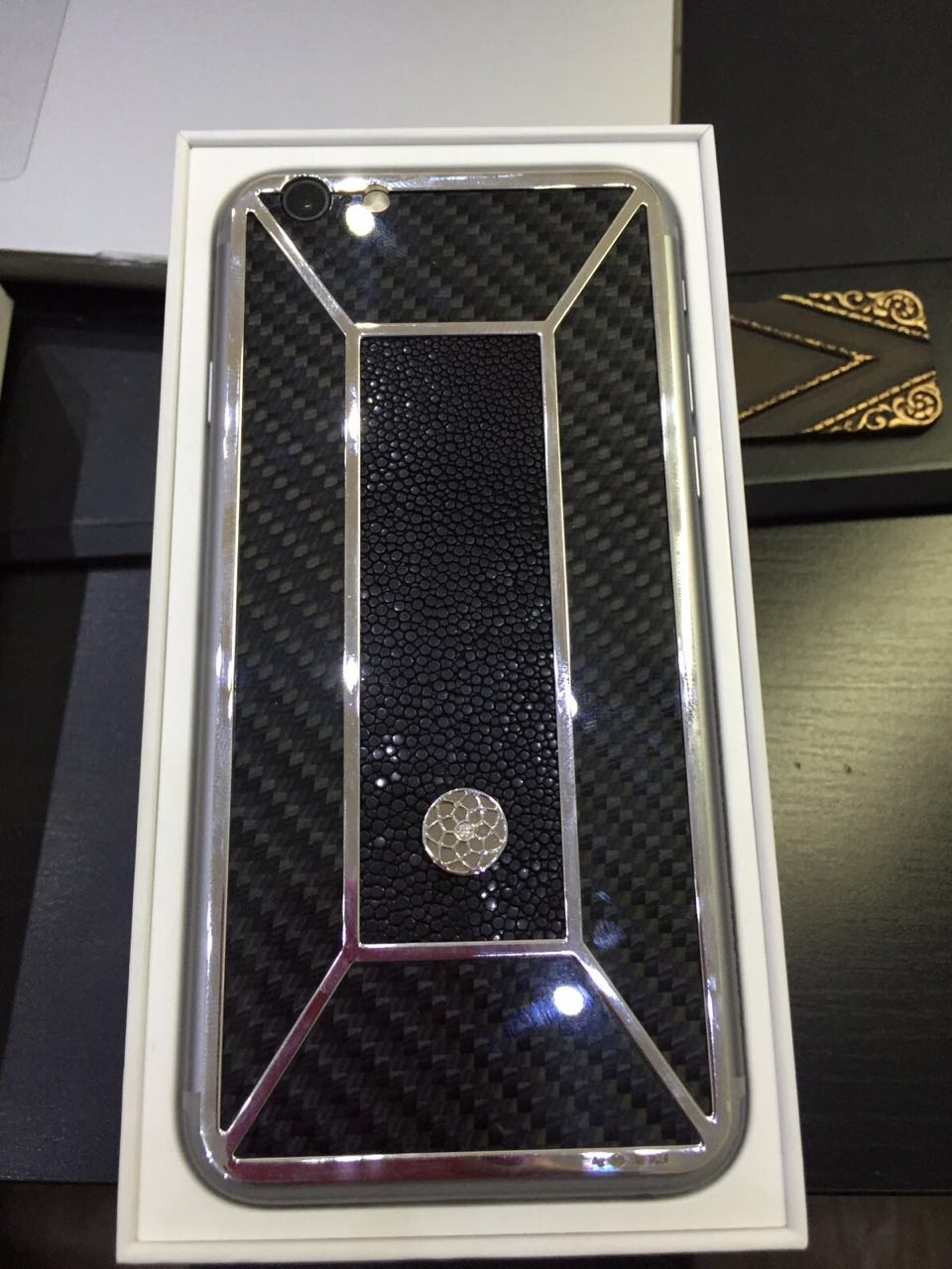 C корпусом из серебра 925 пробы, настоящим очень дорогим карбоном, кожей ската, и фирменной вставкой-логотипом с бриллиантом.
