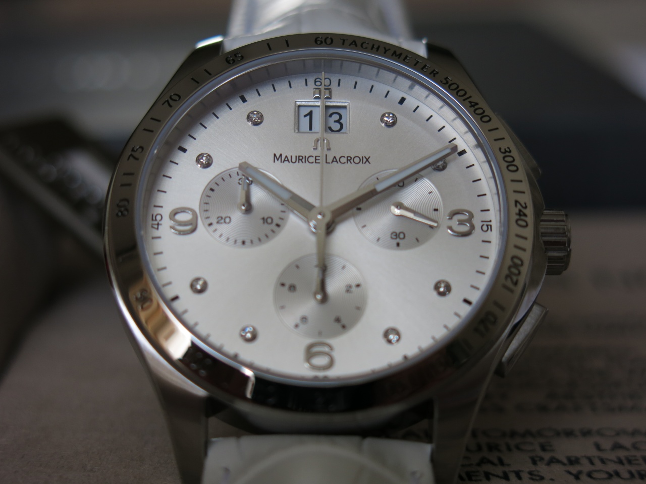 Циферблат: Серебристый сатинированный с большой датой, украшен 8 метками бриллиантами общим весом 0,04 K, Люминесцентные стрелки