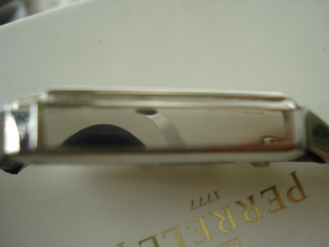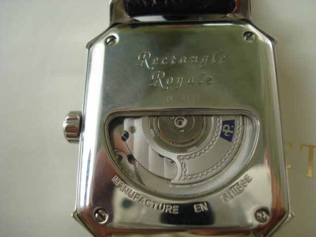 Сапфировое стекло с антибликовым покрытием. Задняя крышка с окошком из сапфирового стекла в форме полумесяца с гравировкой «Rectangle Royale» и серийного номера.