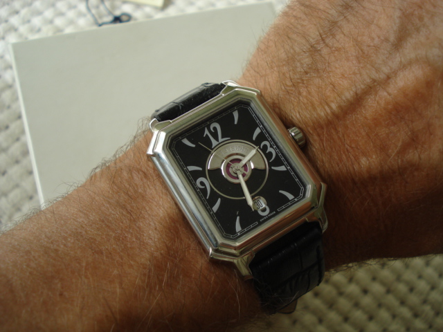 К корпусу крепится ремешок ручной выделки коричневого цвета из кожи аллигатора.