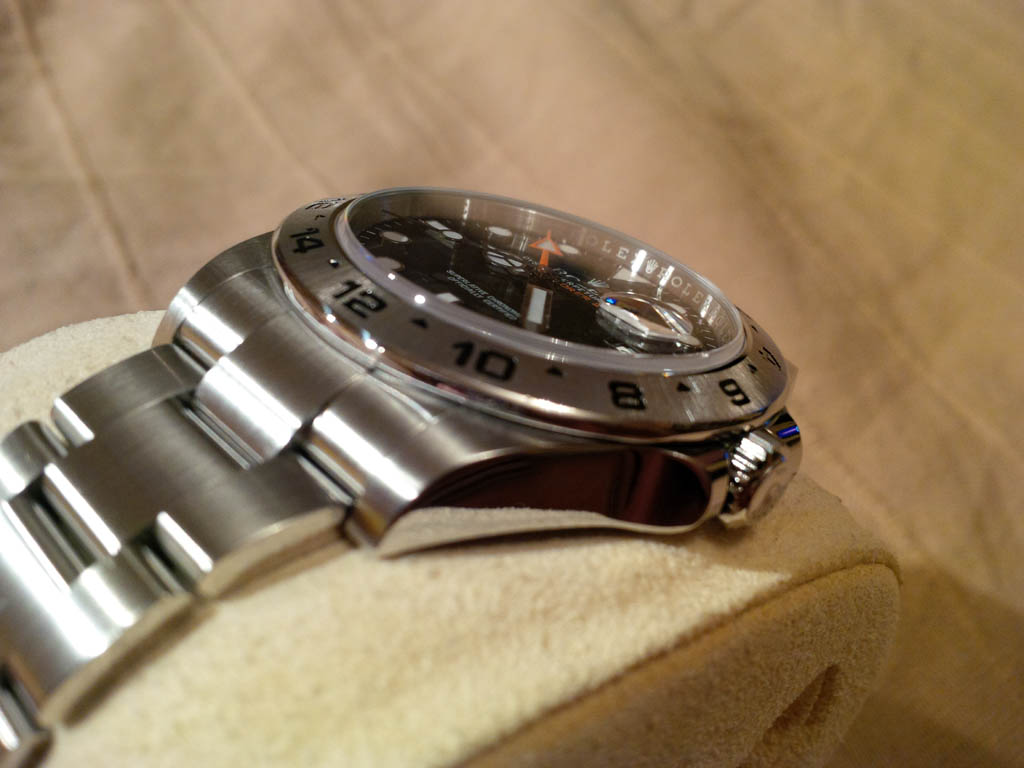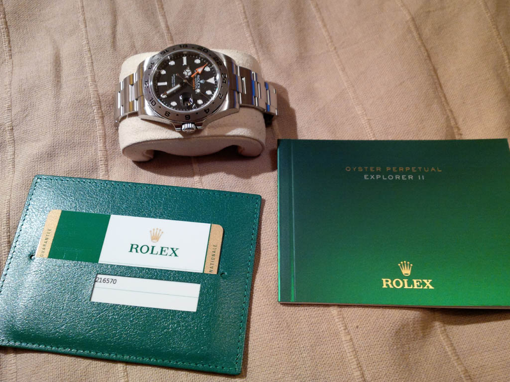 Предлагаю черные Rolex Explorer II. Коробка, бумаги, висюльки-бирюльки в наличии. Обращаю внимание - диаметр 42 мм. Часы большие и довольно тяжелые. В них есть отличная функция - GMT, но расплата за это - отсутствует быстрый перевод даты. Данная модель Ролекса - качественные часы-инструмент.