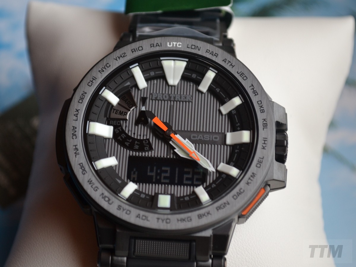 PRX-8000YT-1JF самые лучшие среди Manaslu, часы выполнены из титана, полностью покрыты DLC (прочный углеродный состав). Безель графитового цвета, переливается в зависимости от освещения.