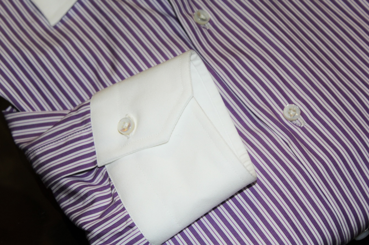Цвет: Белый в сиреневую полоску с белым воротником и манжетами.