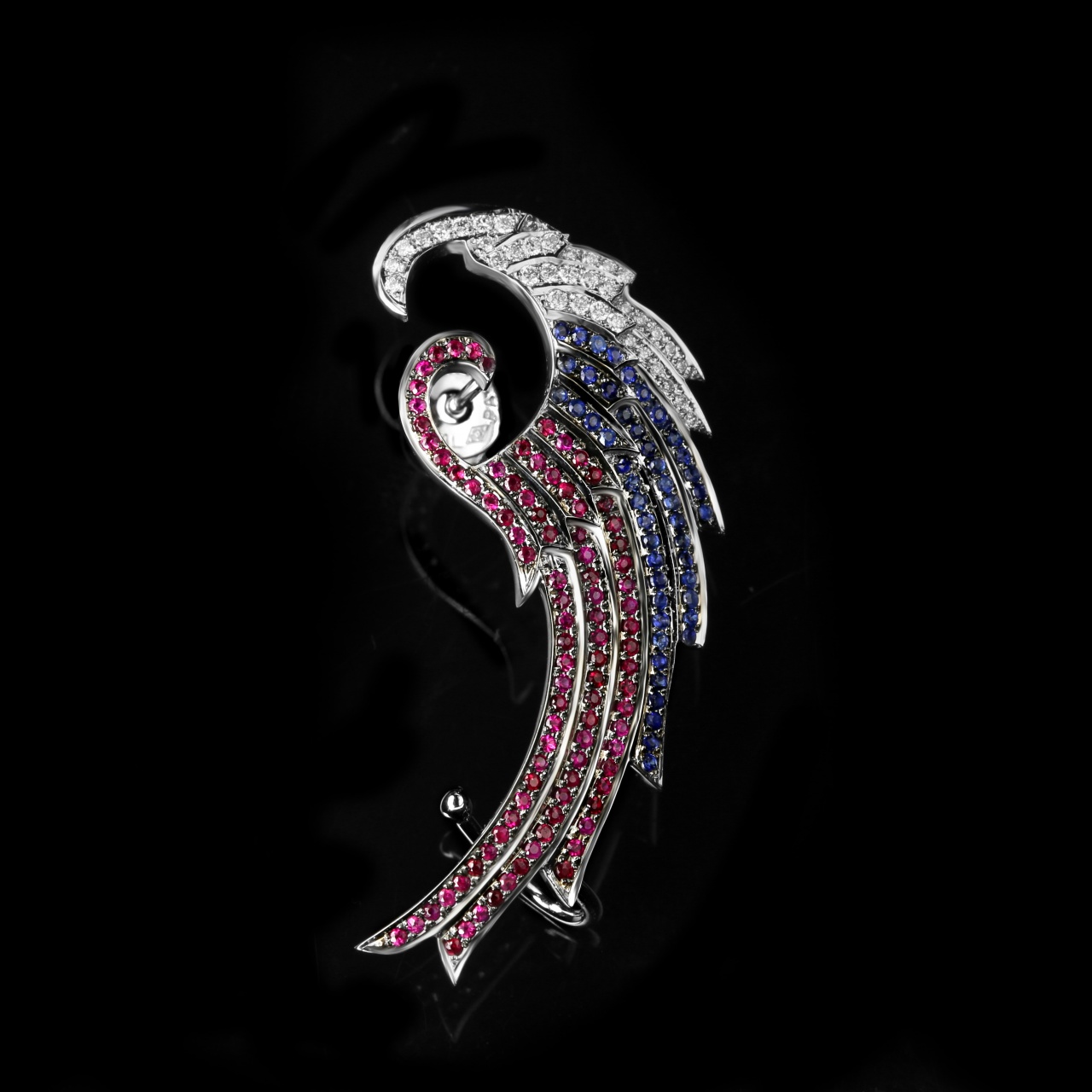В продаже великолепная брошь из белого золота с рубинами, сапфирами и бриллиантами 0,97 карат.