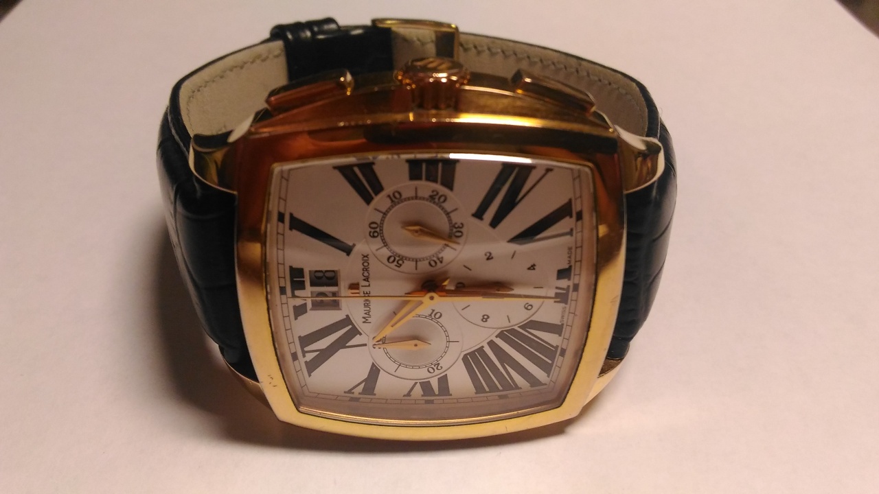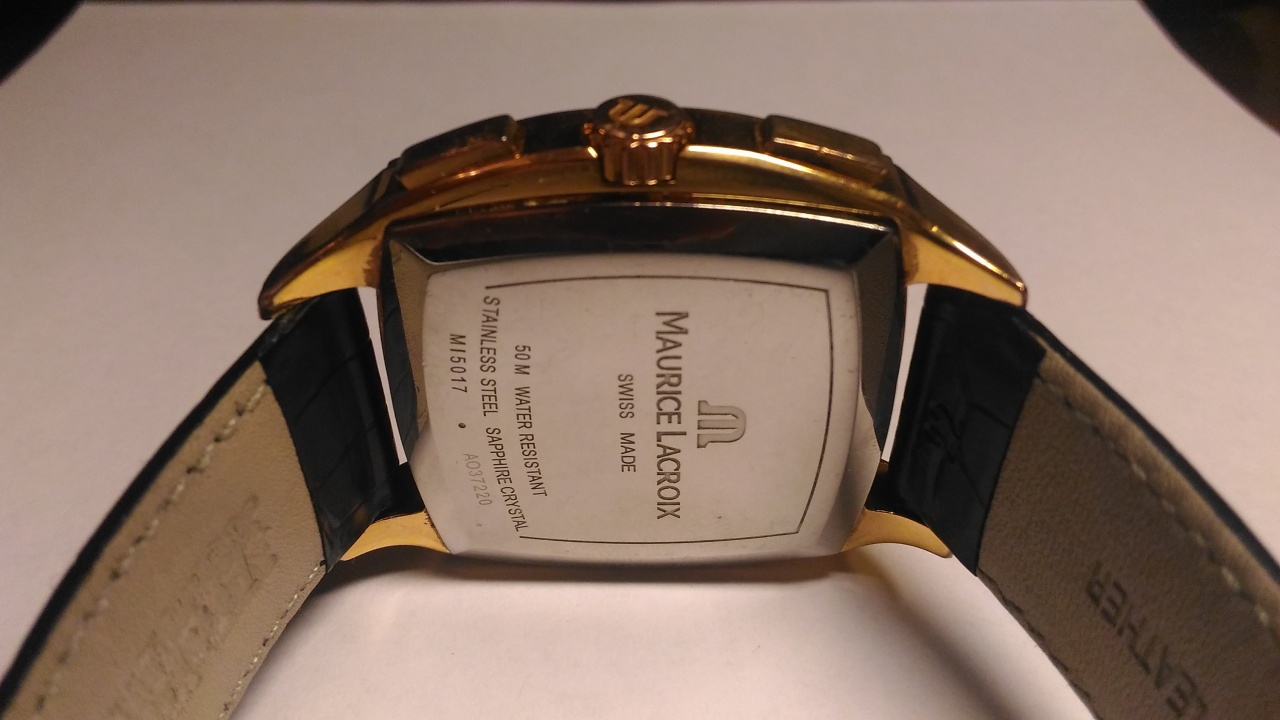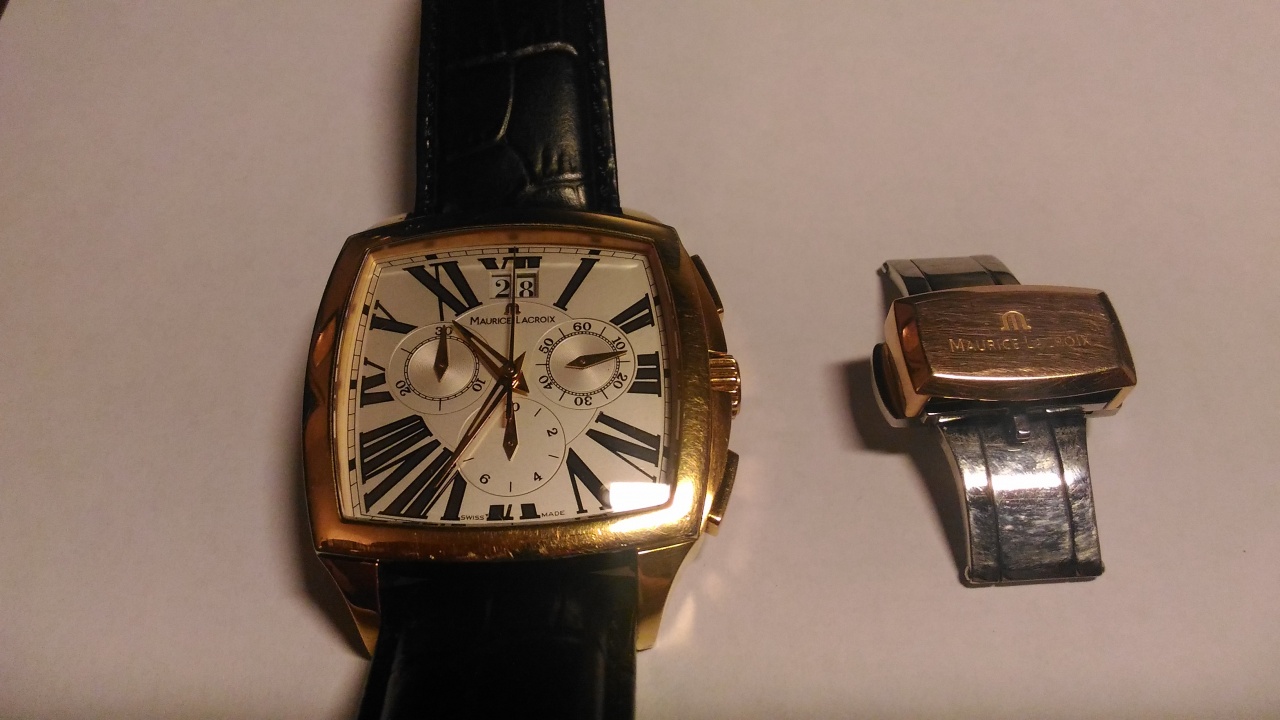 Продаются оригинальные швейцарские мужские часы Maurice Lacroix Miros MI5017-PP011-111 . Кварцевые, хронограф, стекло сапфировое, большая дата, позолоченные. Размер часов: 36 х 39 мм. Водозащита: 50 M. Б/у, состояние хорошее, есть следы носки в виде царапин на корпусе, устраняются полировкой. Ремешок не родной, но сохранилась родная клипса.