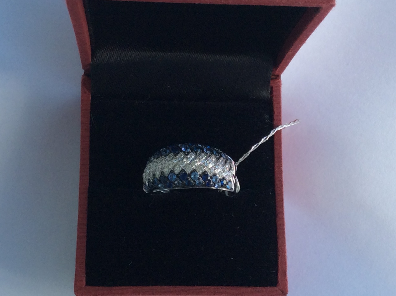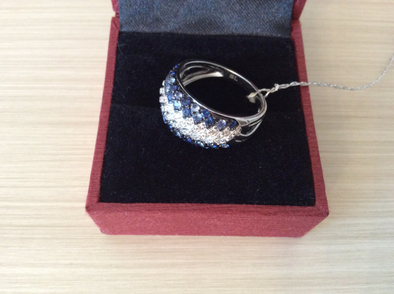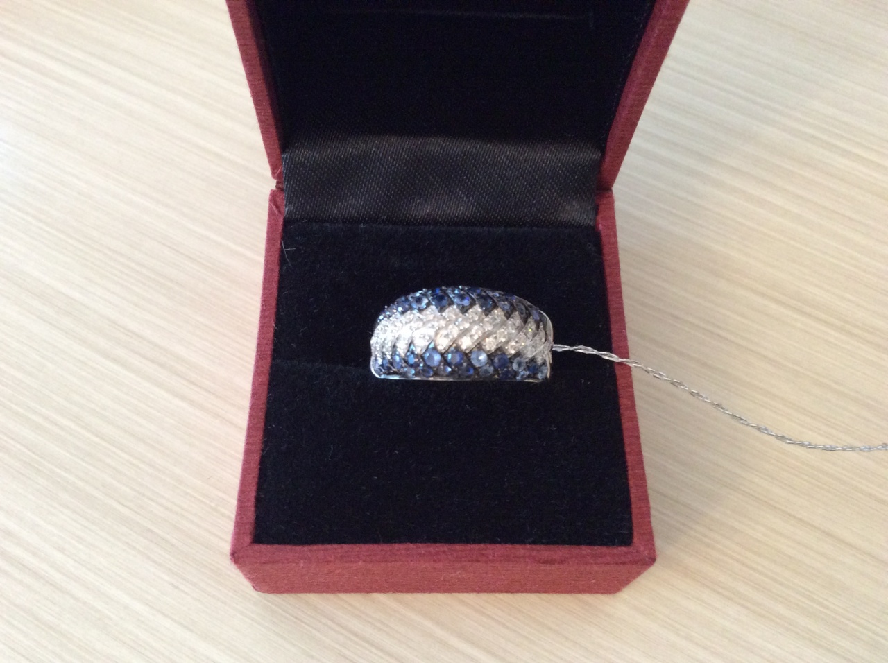 Новое красивое золотое кольцо с бриллиантами и сапфирами с биркой. Белое золото 585 пробы. Вес 3,97 грамма. 44 бриллианта 0,33 ct (4/5), 36 сапфиров 0,72 ct (3/3). Размер 17,5.