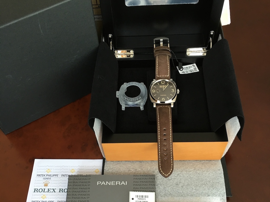 Вниманию уважаемых панеристи предлагается популярная 619-я модель в титановом корпусе диаметром 45 мм с красивейшим циферблатом шоколадного цвета, оснащённая автоматическим механизмом с трёхдневным запасом хода.