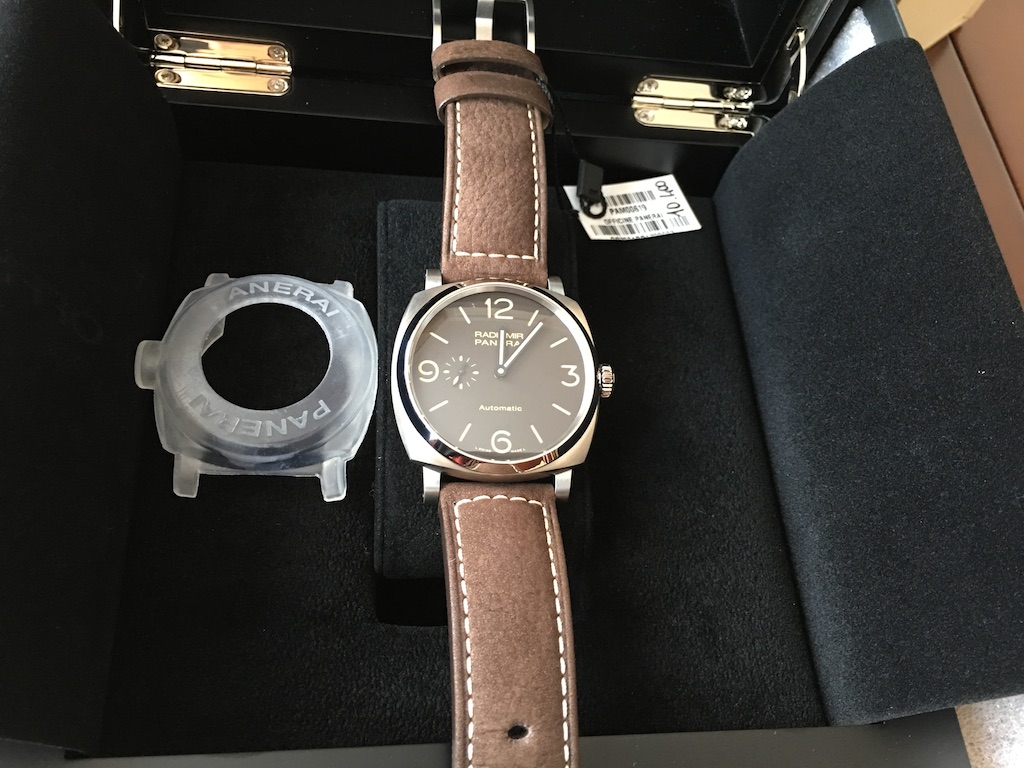 Совершенно новые, в плёнках, часы с полным комплектом упаковки, документов и гарантией официального дилера Officine Panerai, датированной текущим месяцем.