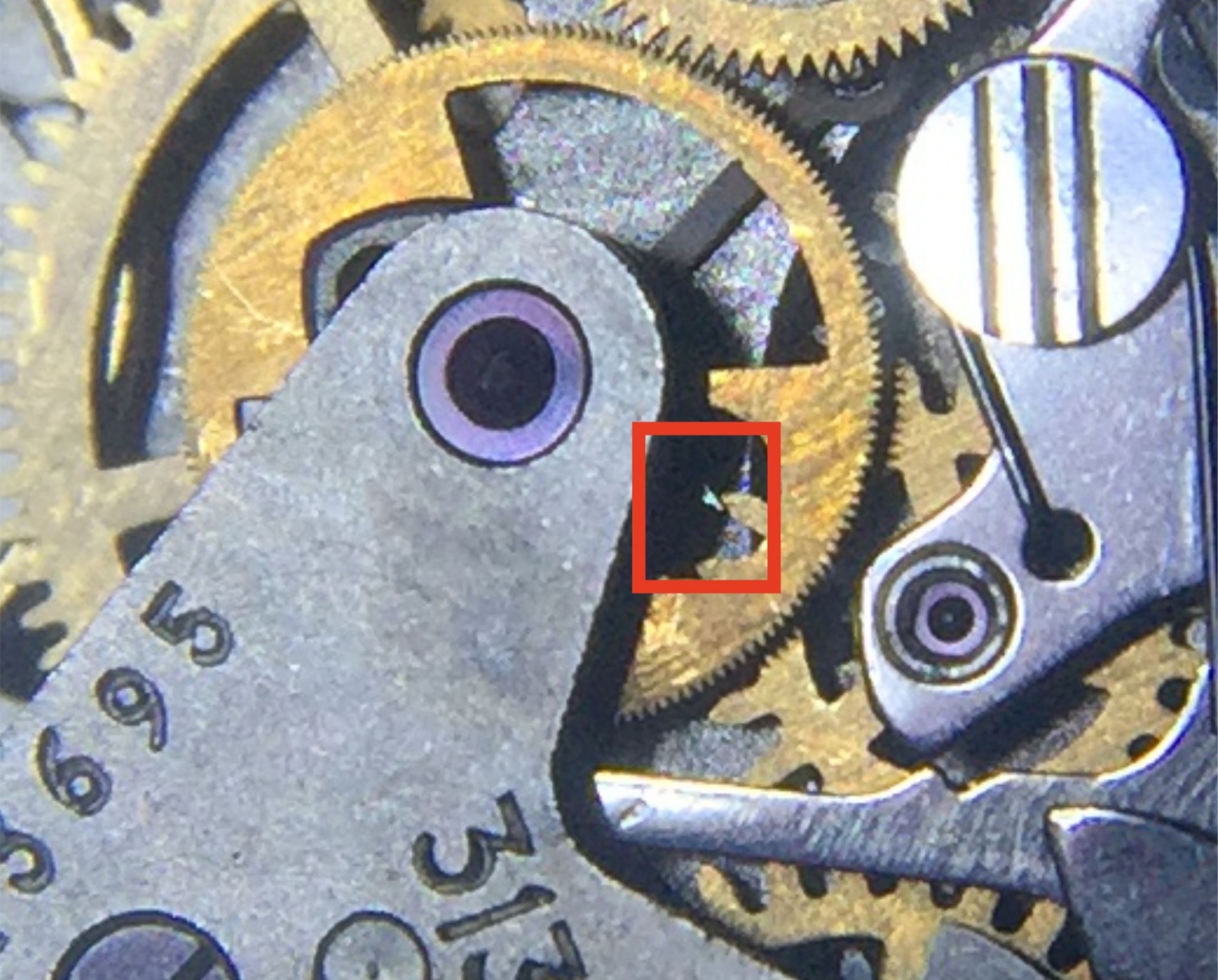 Внимательно через лупу рассмотрел механизм и обнаружил из-за какой шестеренки при запуске хронографа происходит остановка. На фото видно, что это шестеренка, которая отвечает за стрелку накопителя! Я так понимаю, что версия по поводу удара в заводную головку (тем более на ней есть след от удара) наиболее подходящая. На днях куплю стрелкосъемник и проведу самостоятельный ремонт. Потом отпишусь по результату, надеюсь, что все получится. Кстати есть понимание как можно исправить замятие в платине канала оси минутного накопителя в случае если действительно окажется из-за удара по ЗГ?
