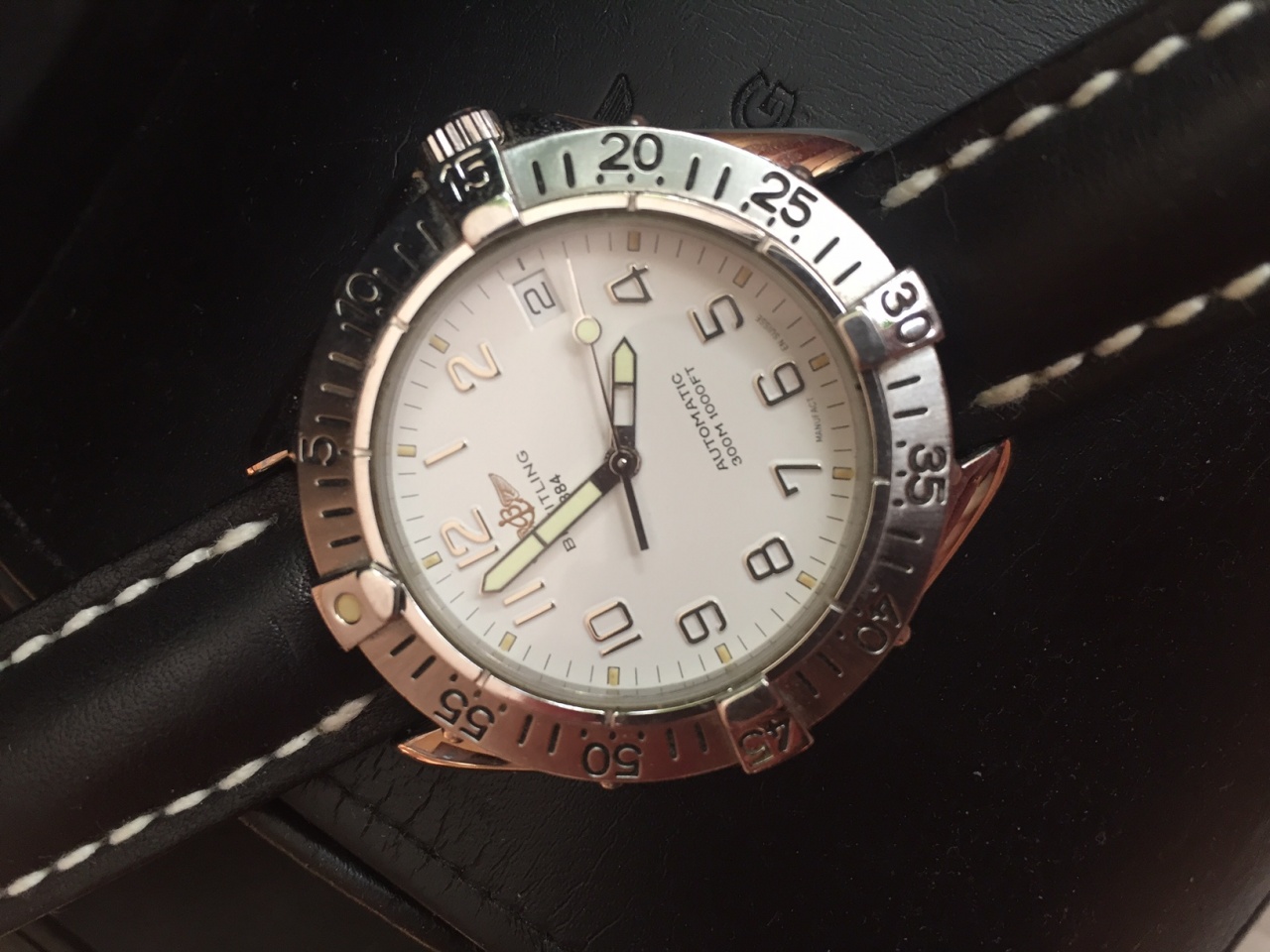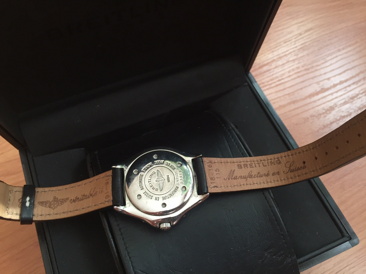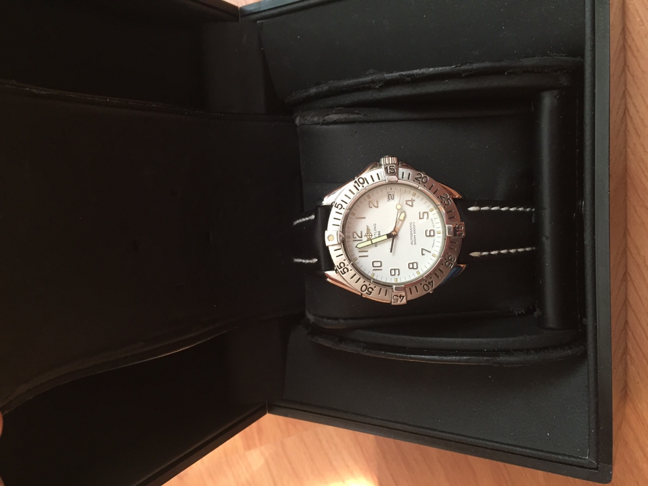 Механизм автоматический Breitling 17. По традиции, сертифицированный хронометр. Корпус - 39 мм, толщина - 13 мм. Водонепроницаемость - 300м. Куплены новыми в Париже в конце 1996-го года, полный комплект: часы, ремень, документы, коробки внешняя и внутренняя.