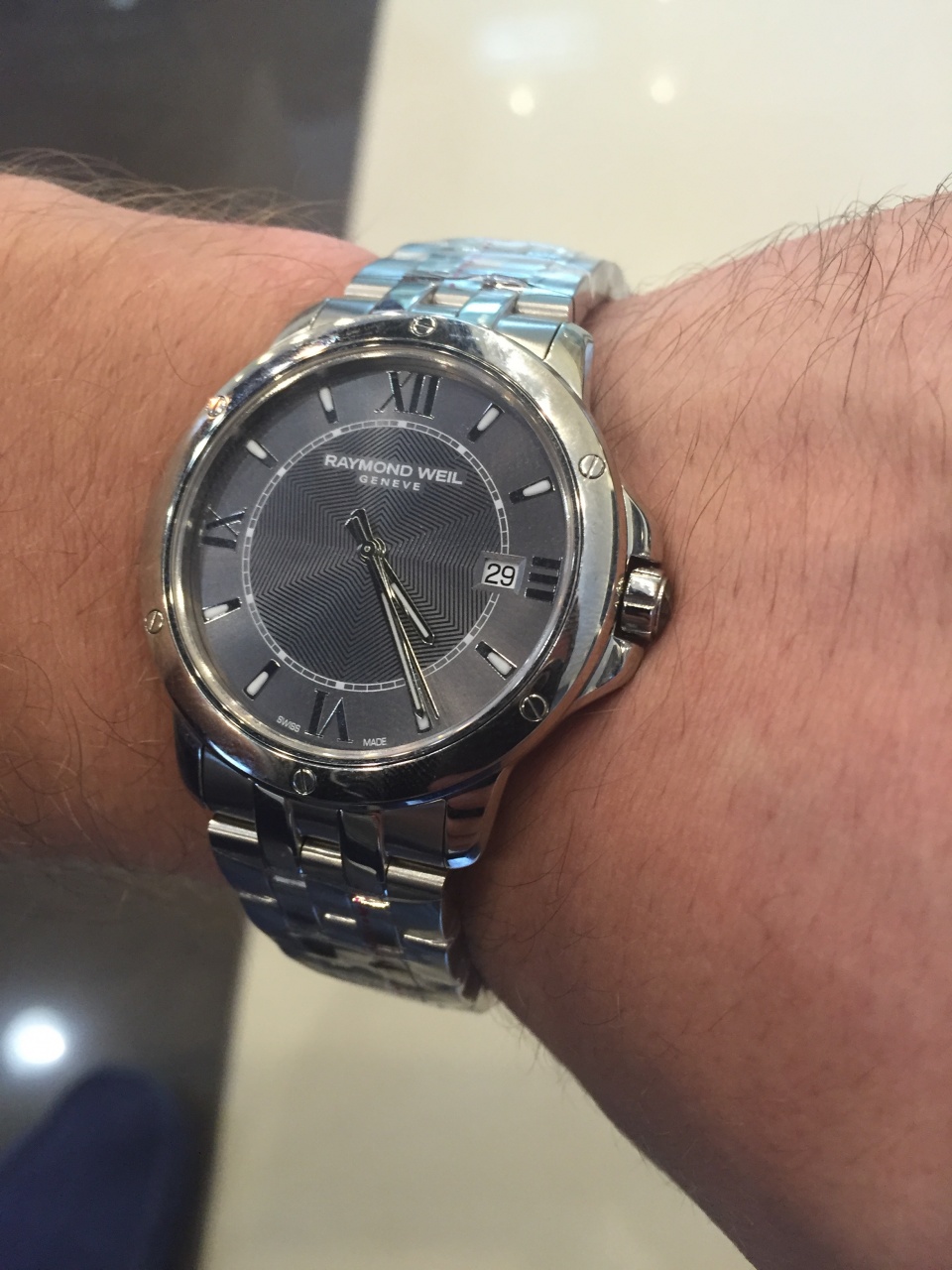 В продаже узнаваемая модель Raymond Weil Tango с элегантными римскими цифрами, серым, играющим на свету циферблатом и глубоким, зачаровывающим гильоше.