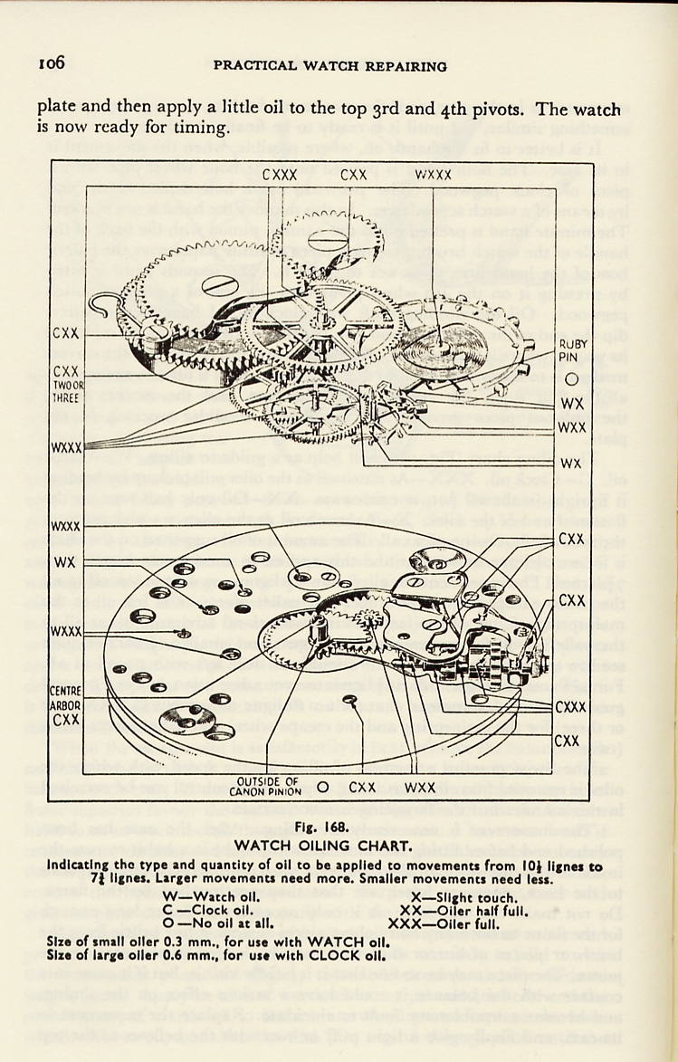 Henry B. Fried также советует смазывать, нижнюю цапфу обязательно, верхнюю только очень слегка. Вопрос является частично спорным в очень маленьких калибров, поэтому нам надо следовать рекомендациям производителя, если таковые есть.