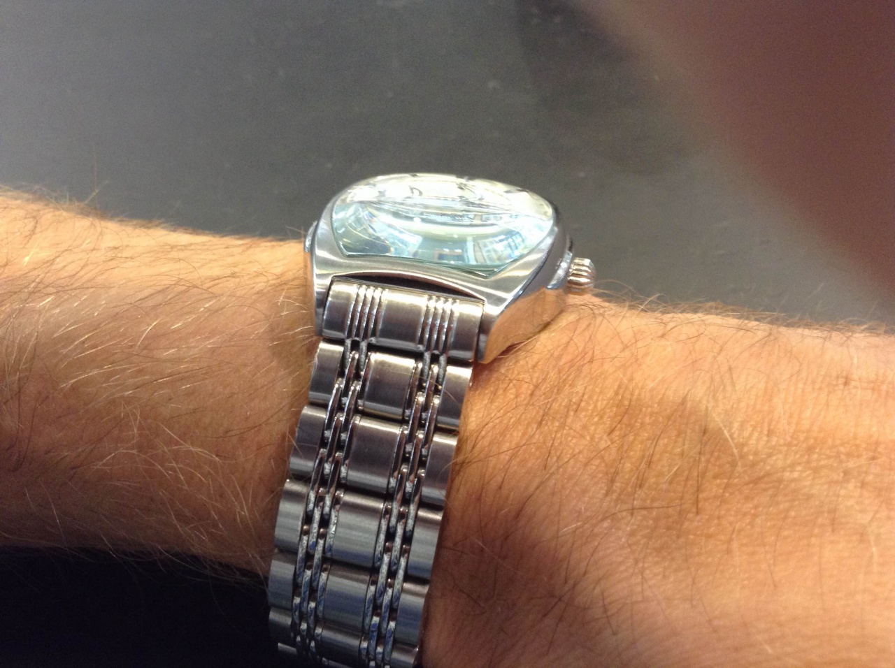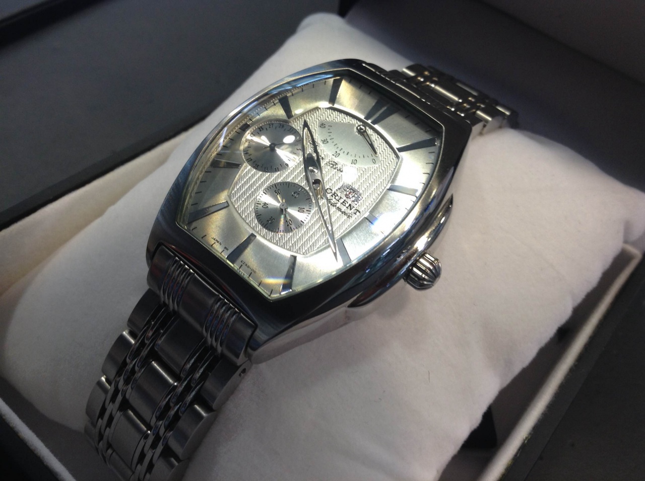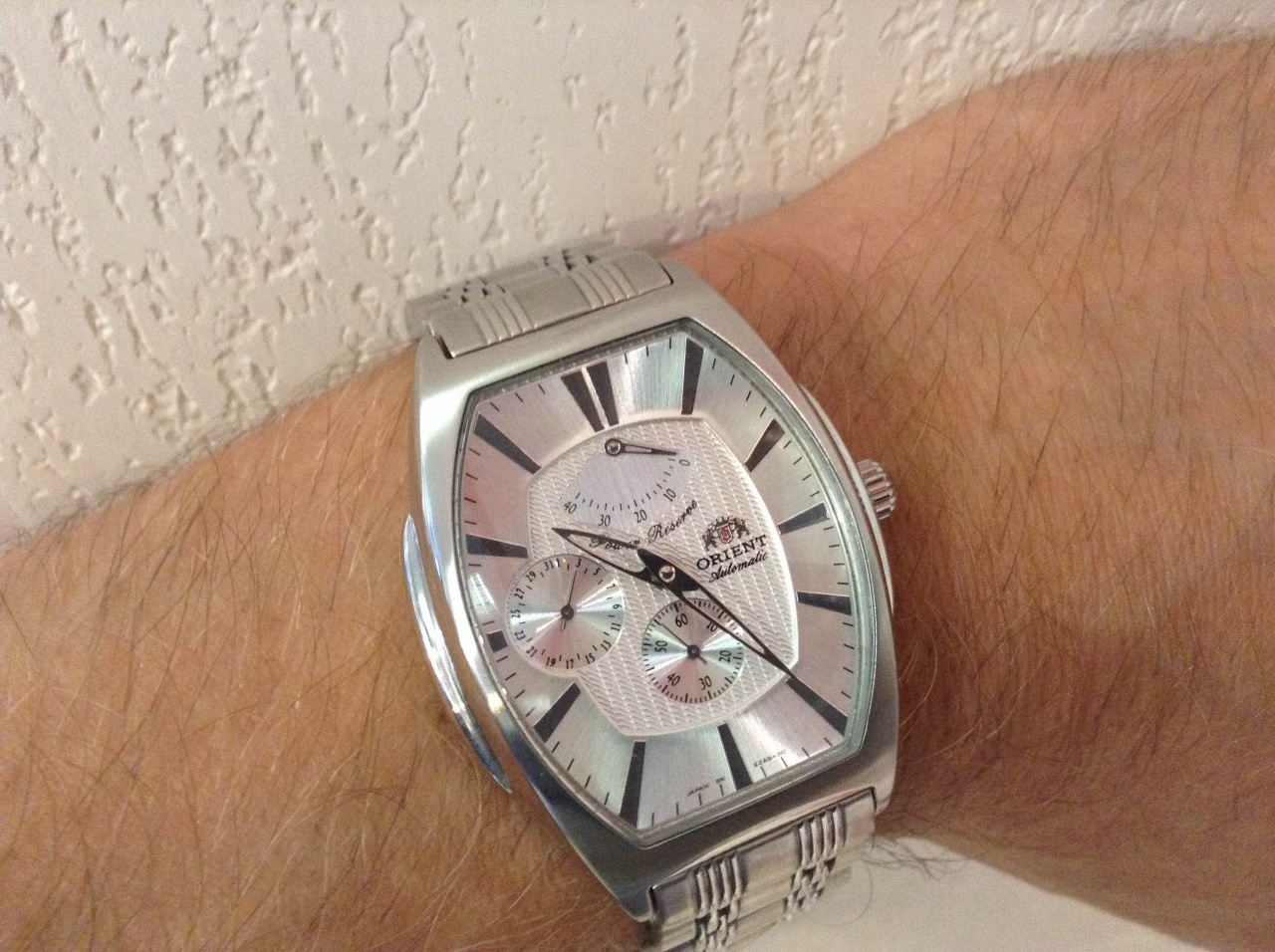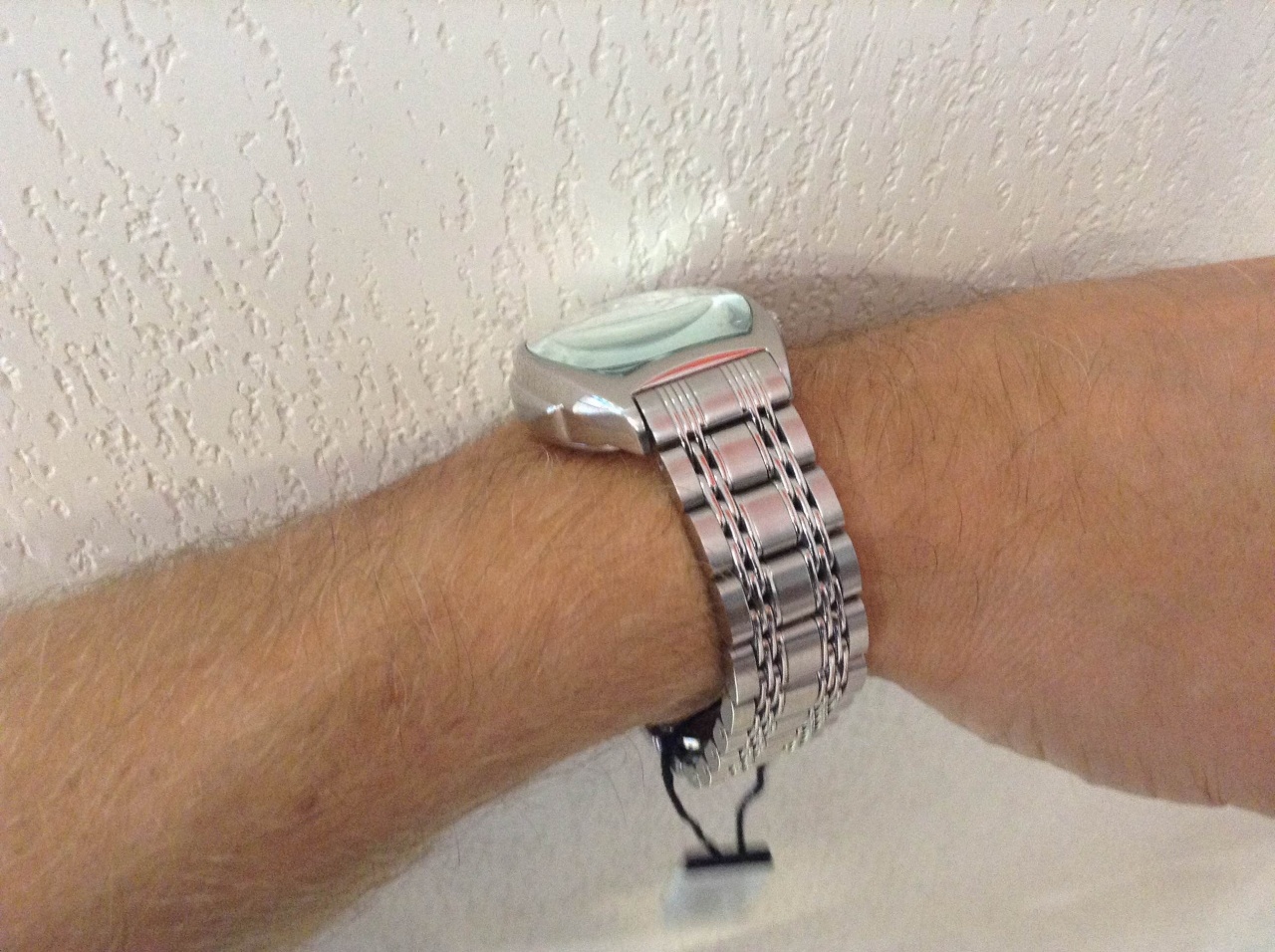 Сами часики имеют бочкообразный стальной корпус. Но вот обработка граней корпуса - разная. По бокам корпус глянцевый. А лицевая сторона имеет сатинирование, равно как и браслет. На фото, кажется, удалось показать.