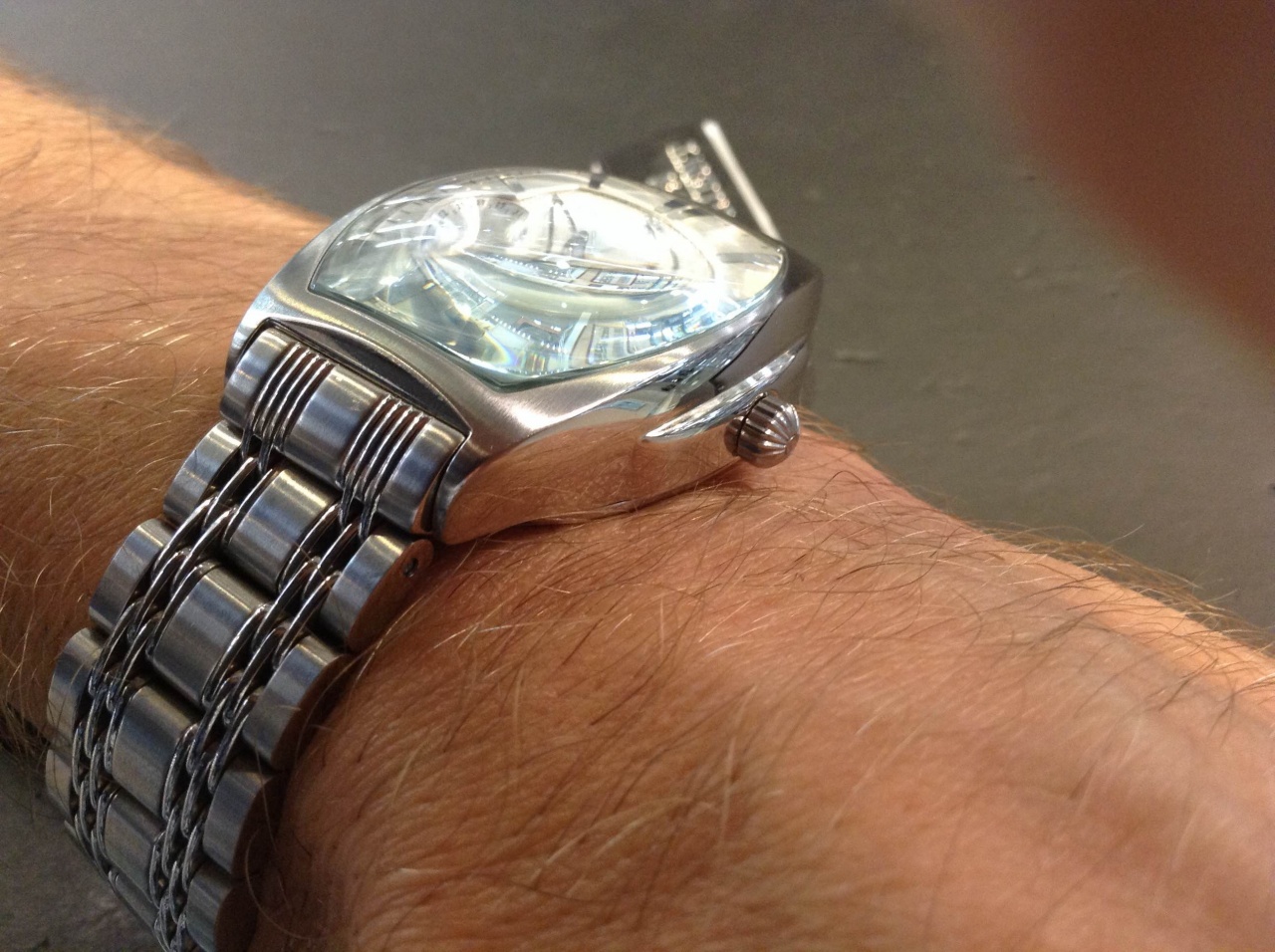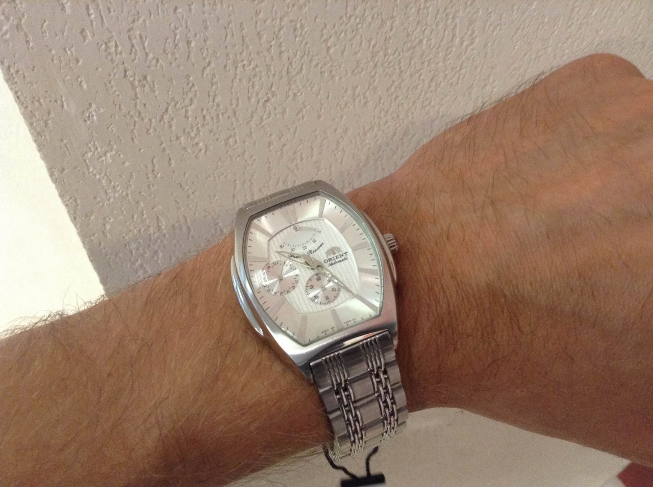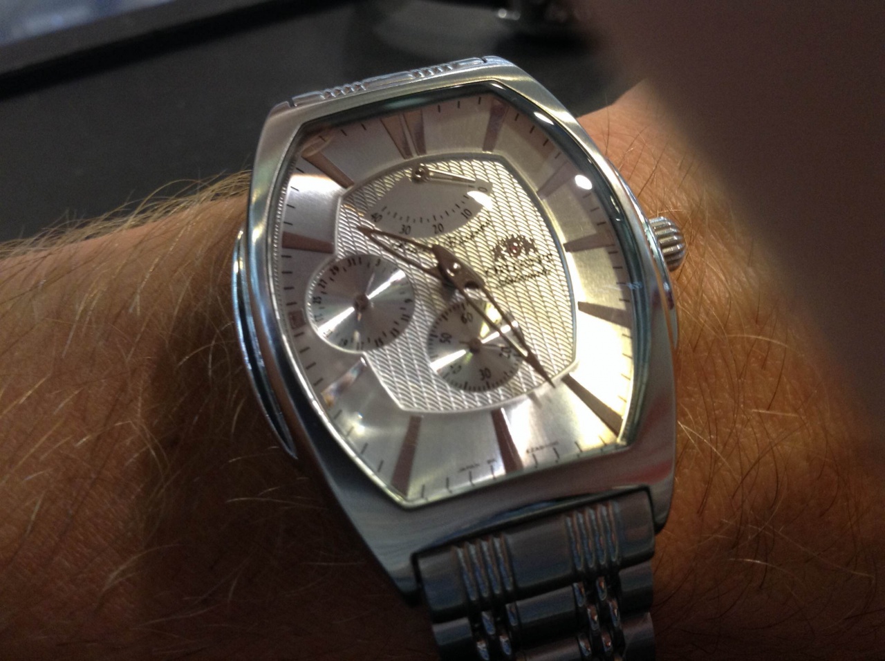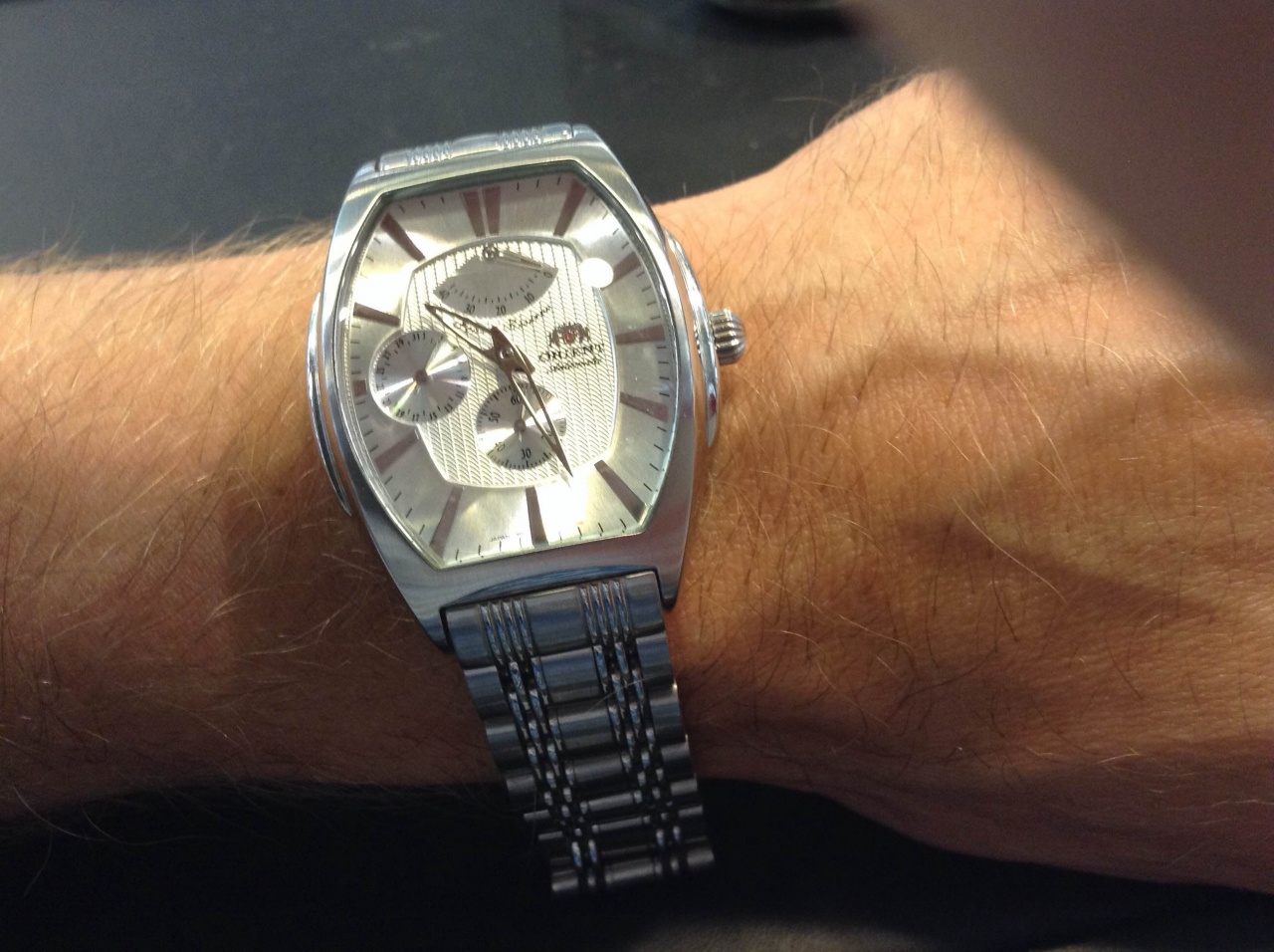 Сами часики имеют бочкообразный стальной корпус. Но вот обработка граней корпуса - разная. По бокам корпус глянцевый. А лицевая сторона имеет сатинирование, равно как и браслет. На фото, кажется, удалось показать.