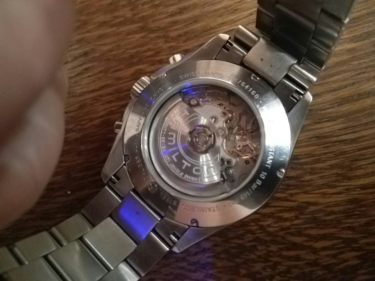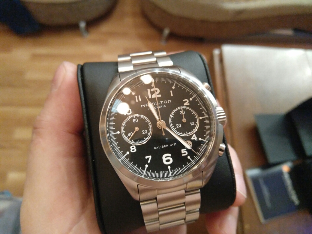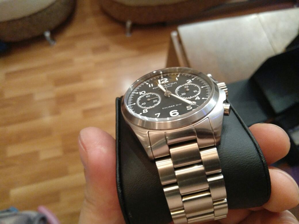 Браслет укорочен на 3 звена - они прилагаются. Также в комплекте бирка с номером модели и ценой (114 200 руб), буклет, гарантийная карта и 2 коробки (внутренняя деревянная и внешняя картонная Hamilton).