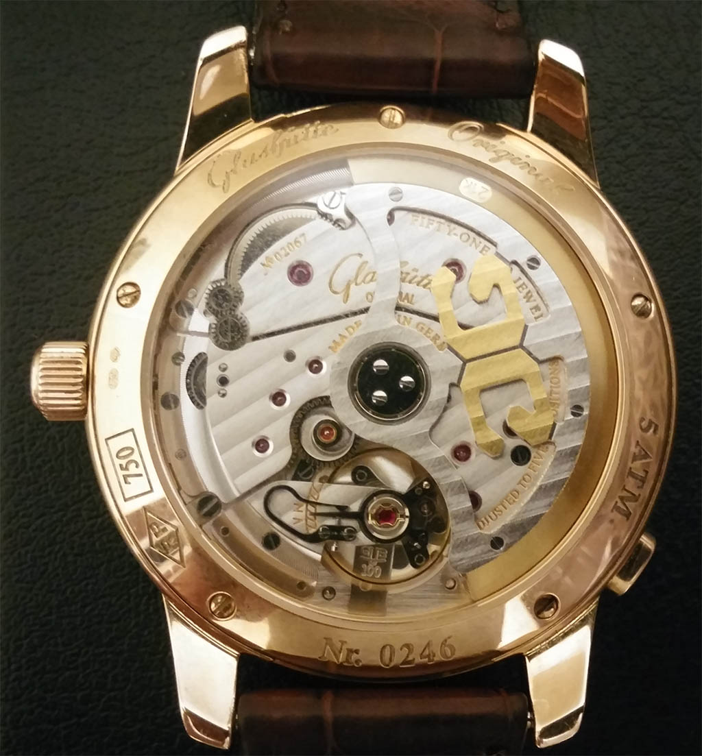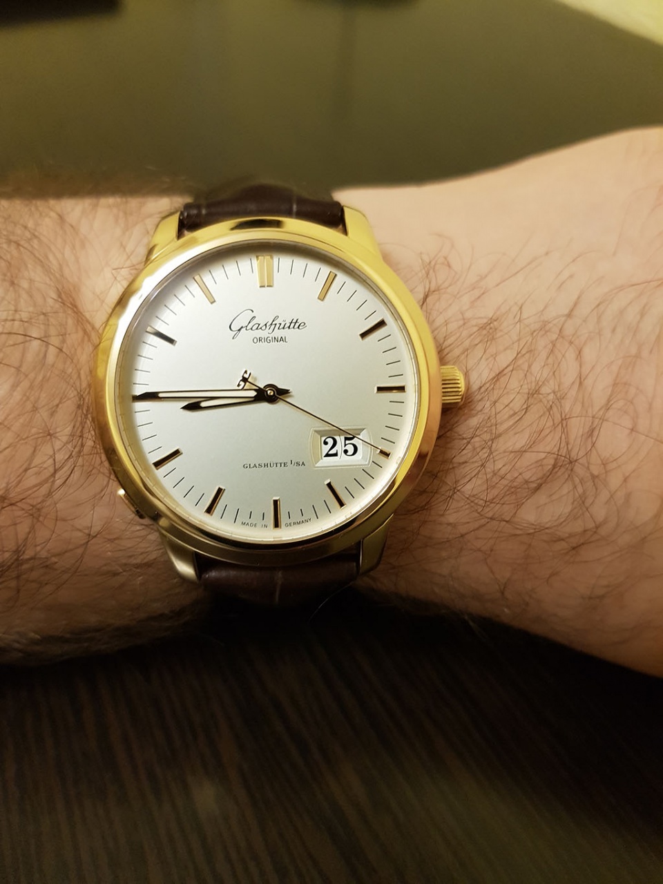 В прошлом году мне достался по вкусной цене Б/У Glashutte Original Senator Panorama Date модель 100-03-11-01-04 (в желтом золоте).