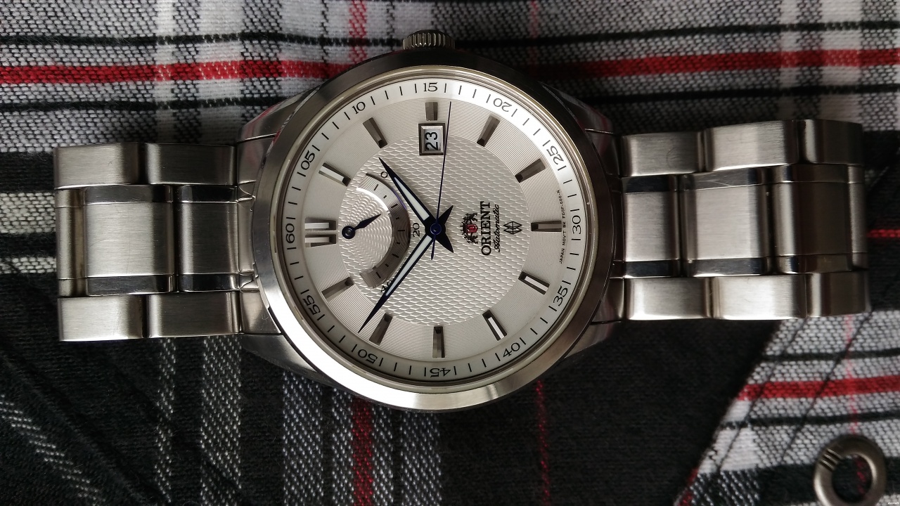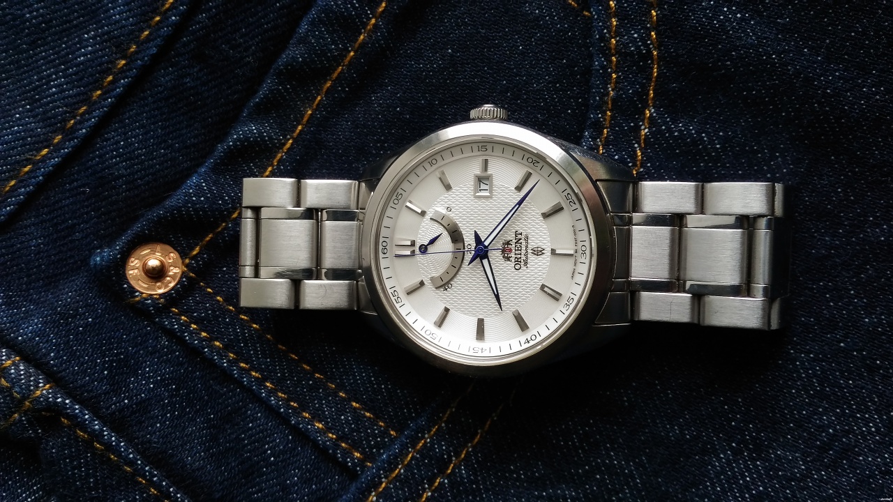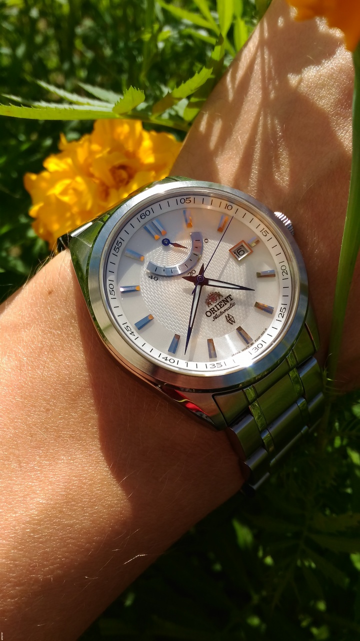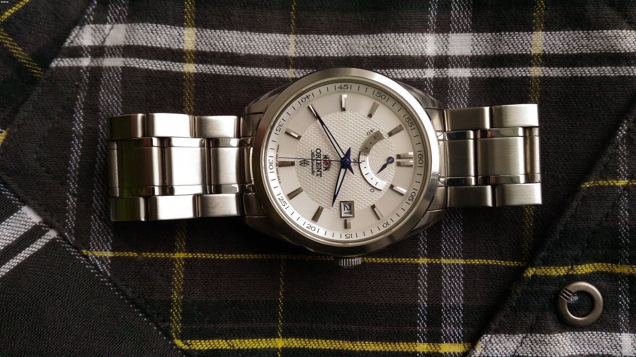 Мужские механические часы на механизме 46N45 Orient Automatic Movement. Класс водонепроницаемости WR50 (душ, плавание без ныряния). Часы выполнены из нержавеющей стали, литой браслет. Лицевое стекло сапфировое, тыльное минеральное через которое виден декорированный ротор и другие части механизма. Размер часов 40x40x12 мм. Люм присутствует на синих вороненых стрелках. Двойное гильоширование циферблата. Есть индикатор запаса хода на 40 часов. Очень красивые накладные метки с перфорацией.