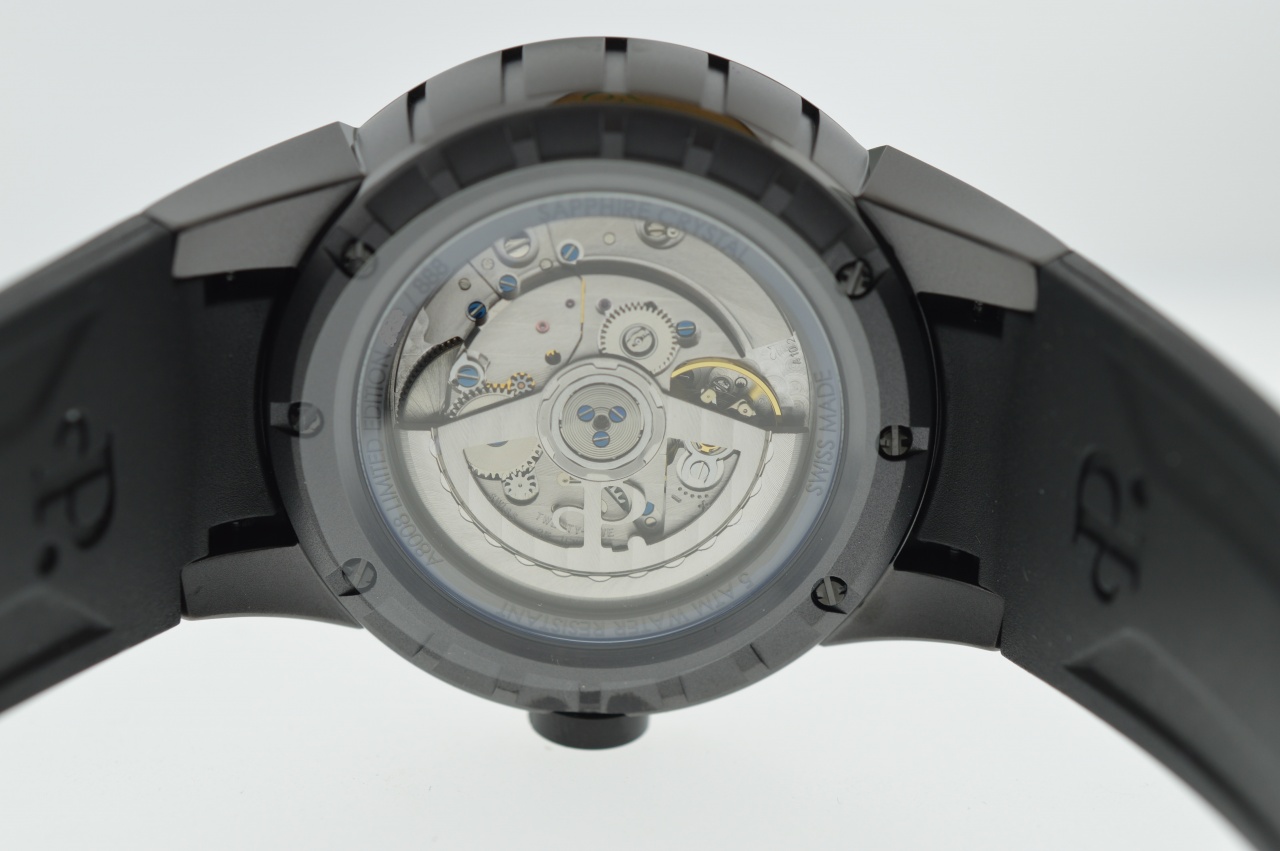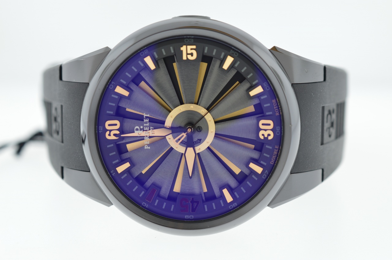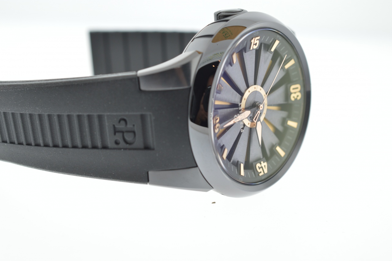 PERRELET представил на суд публики специальную версии своих Turbine Collection. Они посвящены агенту 007 из знаменитой «бондианы» Яна Флеминга (Ian Lancaster Fleming) – модель с черным PVD-покрытием и золотыми циферблатом, индексами и стрелками в тонах заставок первых фильмов. Серия ограничена 888 экземплярами. Корпус имеет 44мм в диаметре и 12,5мм в высоту и выполнен из нержавеющей стали с DLC-покрытием. Стекло сапфировое с двойным антибликовым покрытием. Водостойкость 50 метров. Механизм остался прежним – автоматический калибр P-181 с двойным ротором, являющейся отличительной особенностью марки.