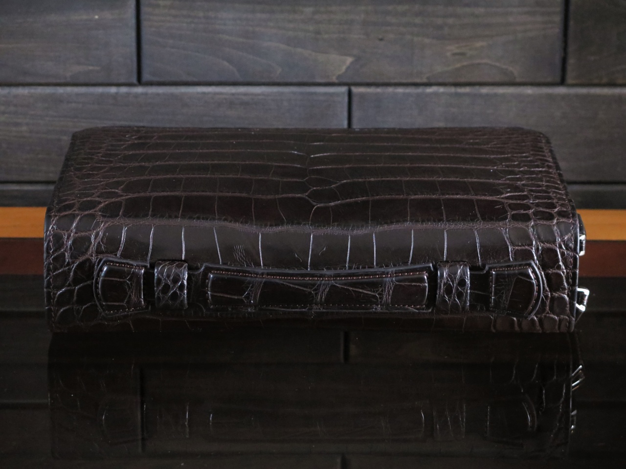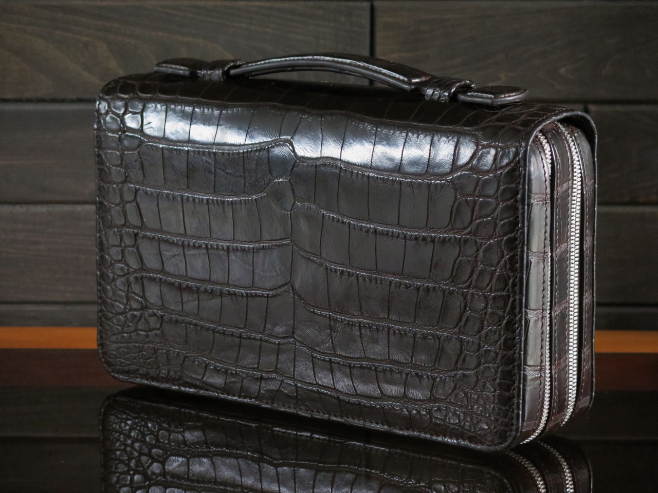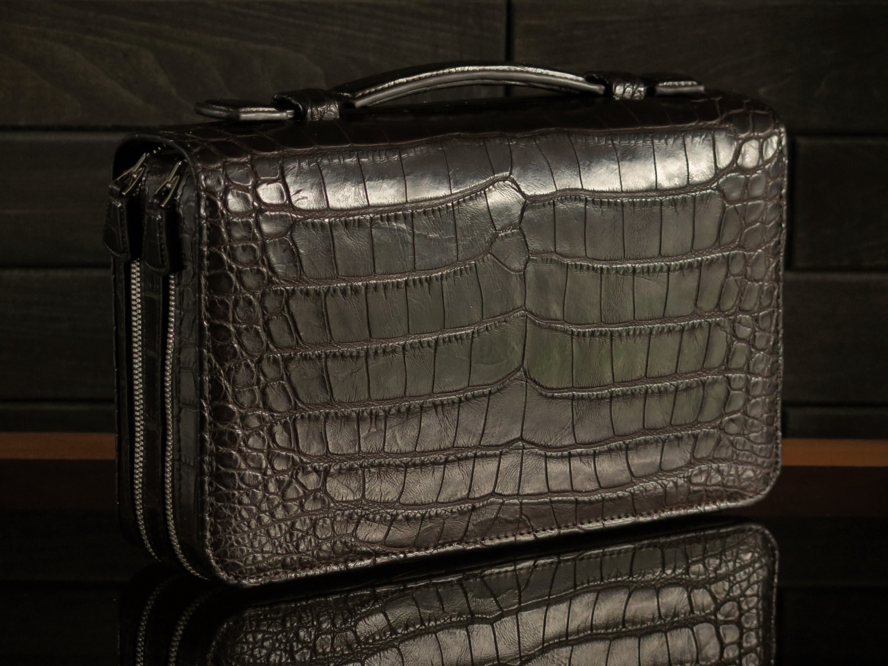 Клатч изготовлен из 100% кожи миссисипского аллигатора высочайшего качества выделки с матовой поверхностью, из цельного куска с живота рептилии.