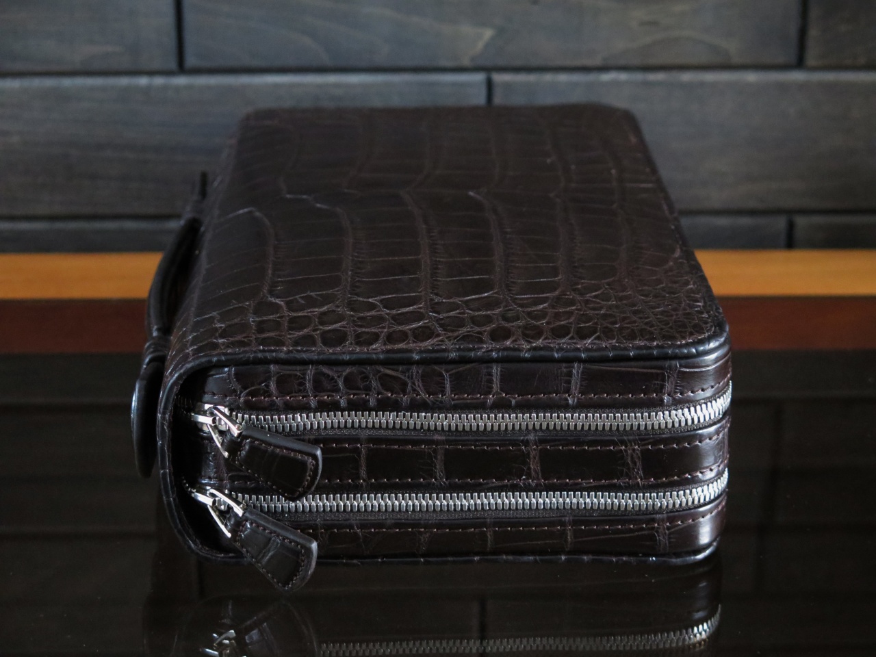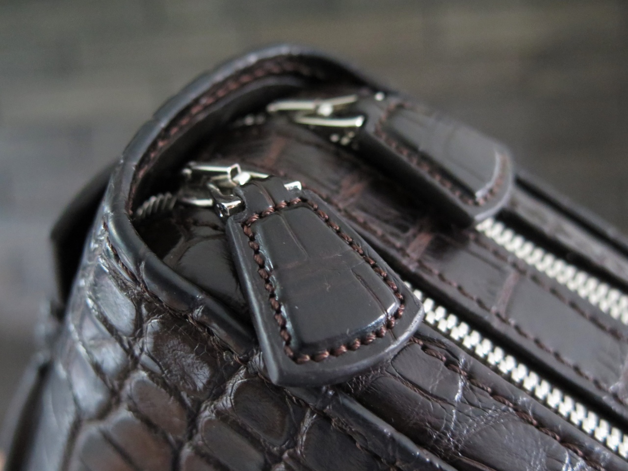 Клатч застёгивается на две эксклюзивные молнии из топовой линии YKK, изготовленные из никеля, покрытого палладием, с бегунками из кожи аллигатора.