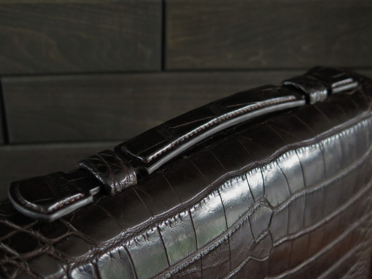 Сверху клатч-барсетка имеет ручку портфельного типа для переноски в руке, изготовленную из кожи аллигатора.