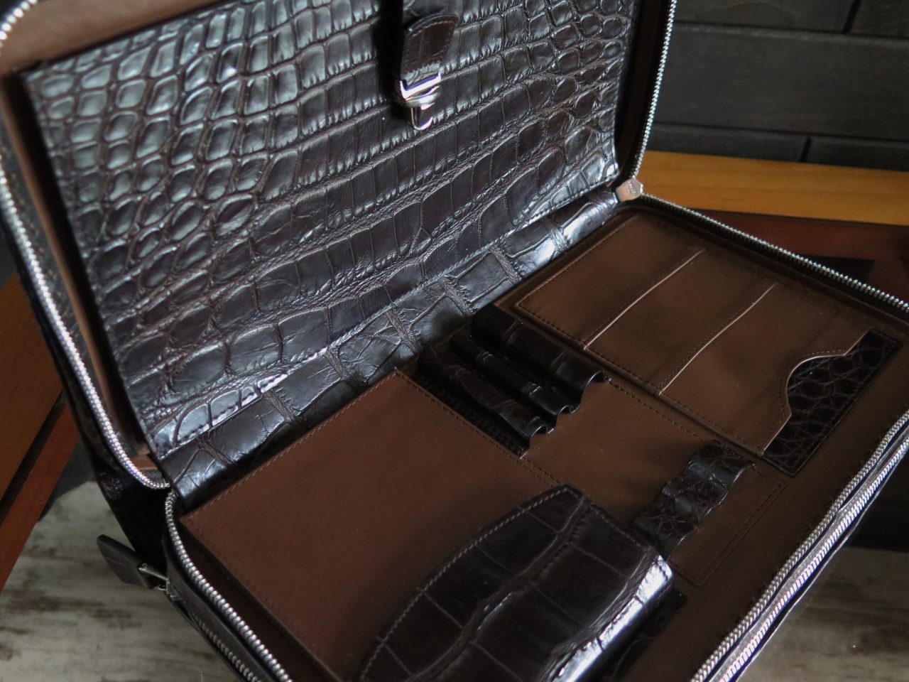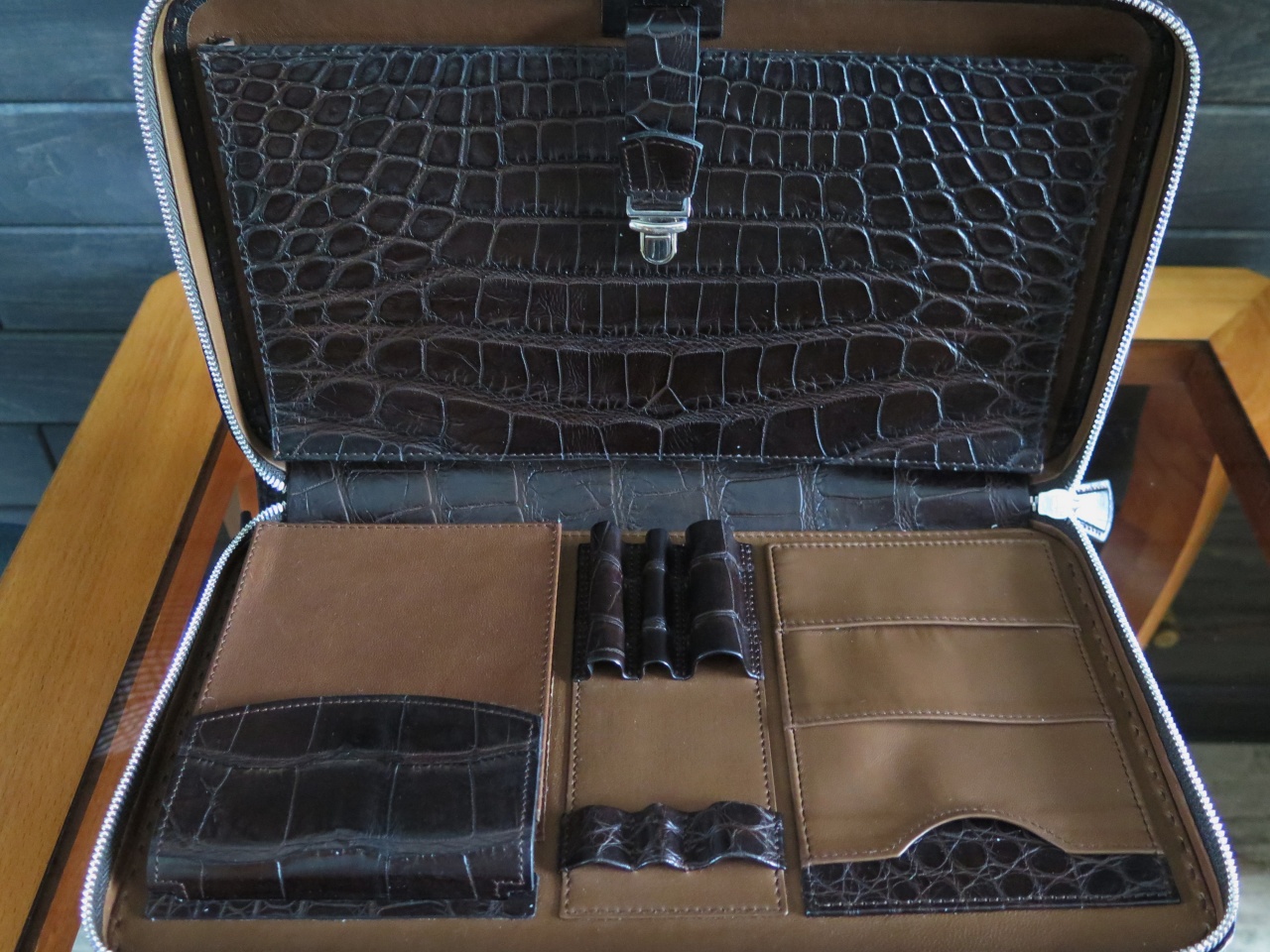 Второе отделение имеет вместительный карман, изготовленный из кожи миссисипского аллигатора, застегивающийся на небольшой замочек, и предназначенный для переноски планшетного компьютера типа iPad Mini или документов, 1 карман для хранения двух паспортов, отделения-хлястики для трех авторучек, три отделения для авто документов (тех.талон, водительские права) или визитных карточек.