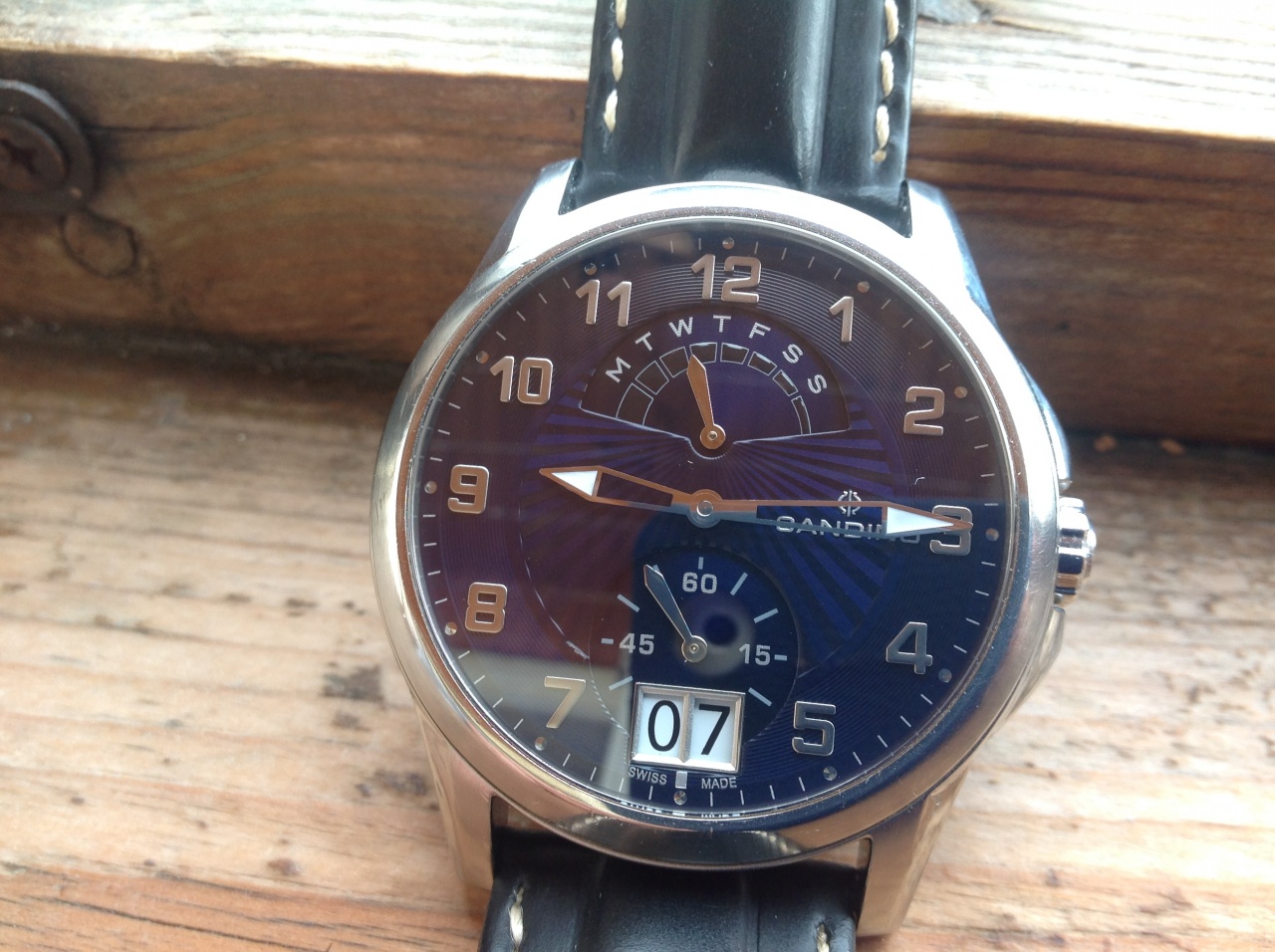 В продаже изумительной красоты часы CANDINO Big Date,прекрасно смотрятся на любом запястье.Великолепно гильошированный циферблат,стрелочный день недели,большая дата,сферический сапфир,диаметр 43мм.Указана водозащита 100м.,но на воду испытать не рискнул.На топовом калибре RONDA.Носил постоянно где-то полгода после покупки,затем заменил ремешок на Lerman с водозащитой,т.к.оригинальный износился в районе застёжки,и положил в шкаф.Хочу продать,т.к.в последнее время предпочитаю механику.Пересыл возможен по предоплате.