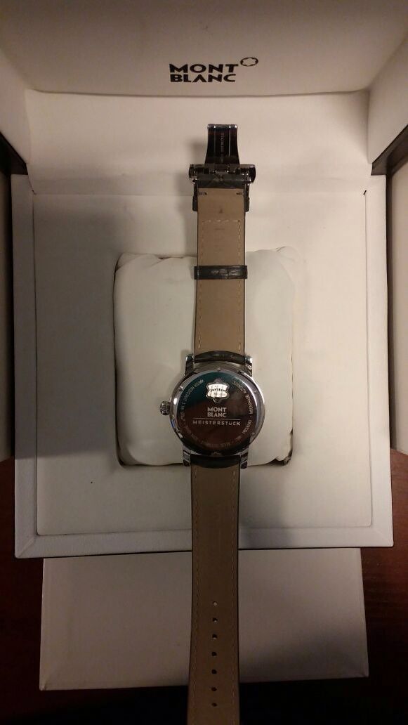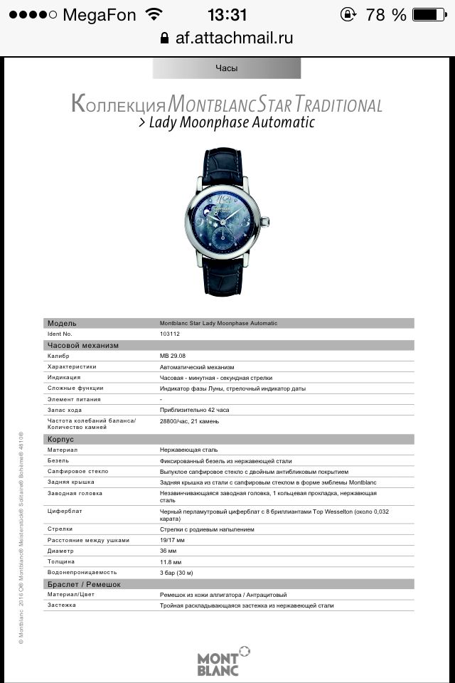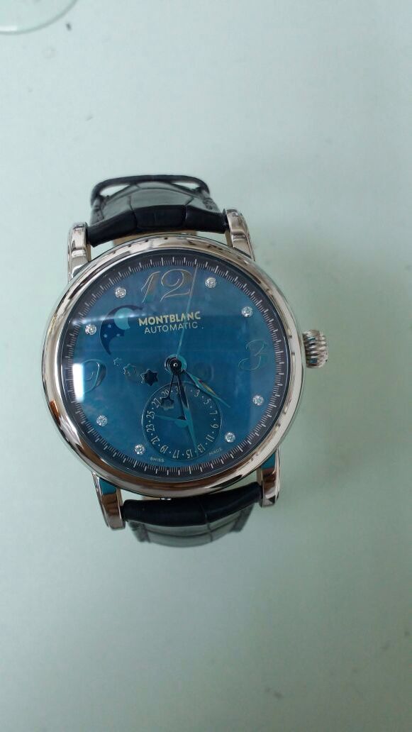 Продаются Женские швейцарские механические наручные часы Montblanc MB103112.Часы в корпусе из нержавеющей стали диаметром 36 мм с перламутровым циферблатом украшены они 8 бриллиантами 0,032К ,есть индикатор даты, индикатор фазы Луны.На задней крышке имеется сапфировое окошко в форме эмблемы Montblanc, через которое можно наблюдать работу механизма часов.В механизме 21 камень, частота 28800 полуколебаний в час. Запас хода 42 часа.