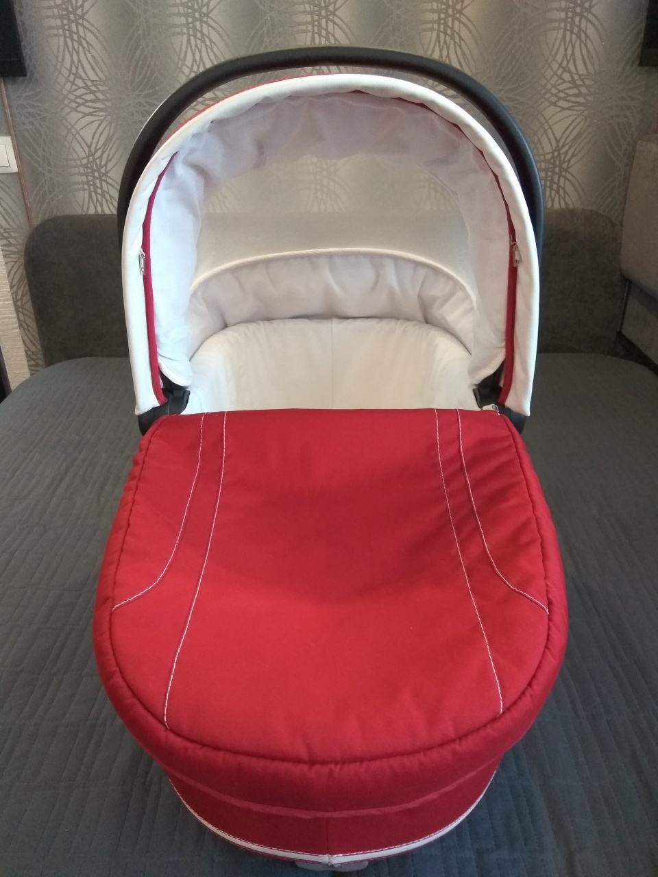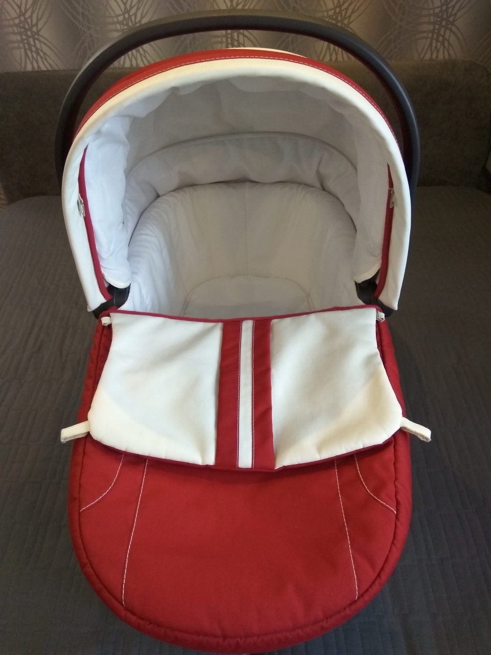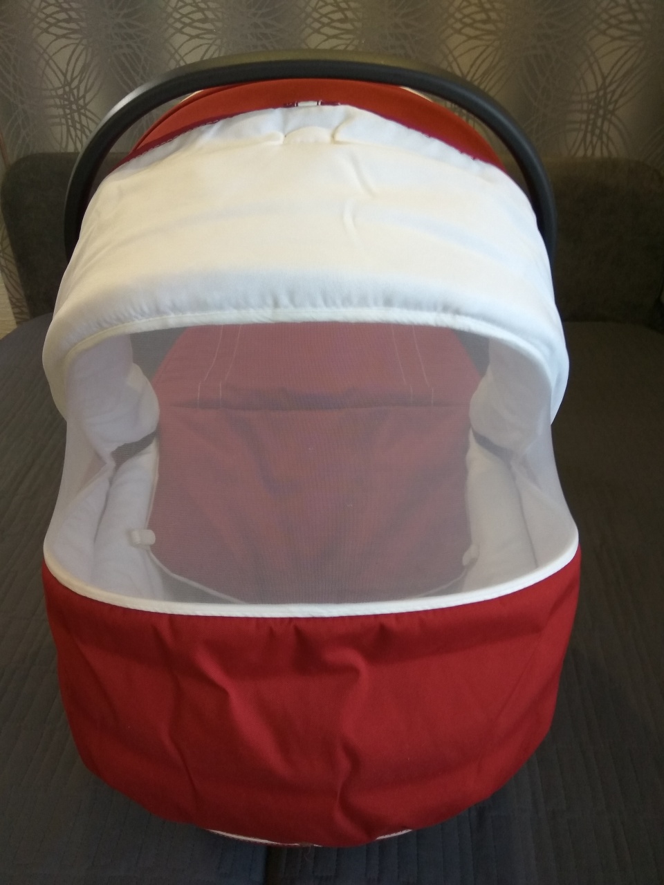 Очень удобно переносить за ручку, на капюшоне есть проветривание, ткань не промокает, текстиль снимается для стирки, ножки в основании позволяют использовать люльку как спальное место.
