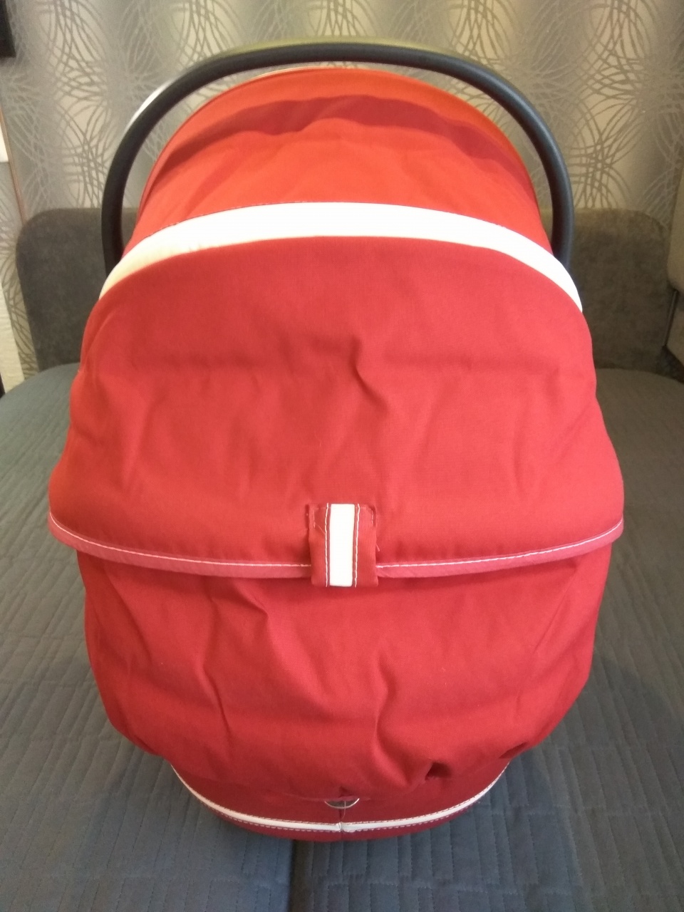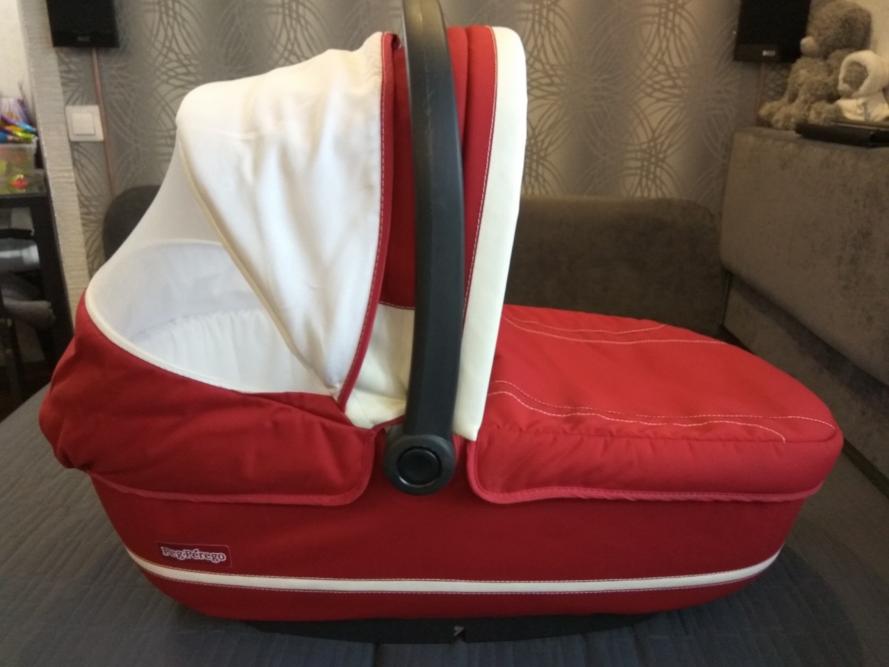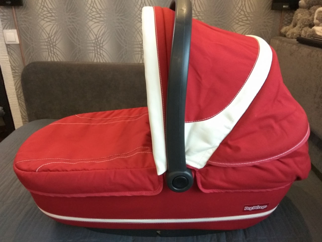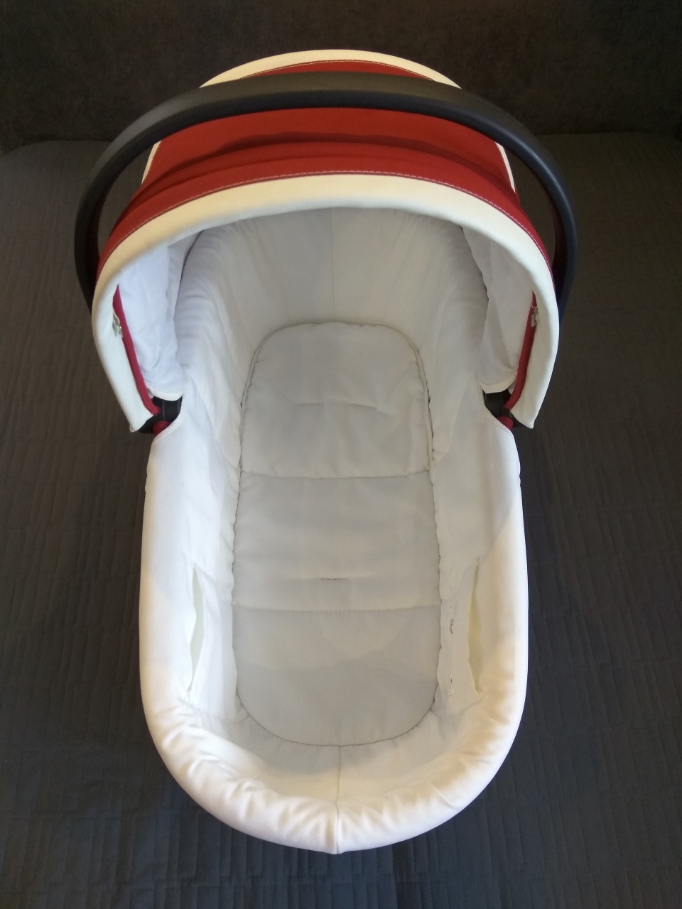 Очень удобно переносить за ручку, на капюшоне есть проветривание, ткань не промокает, текстиль снимается для стирки, ножки в основании позволяют использовать люльку как спальное место.