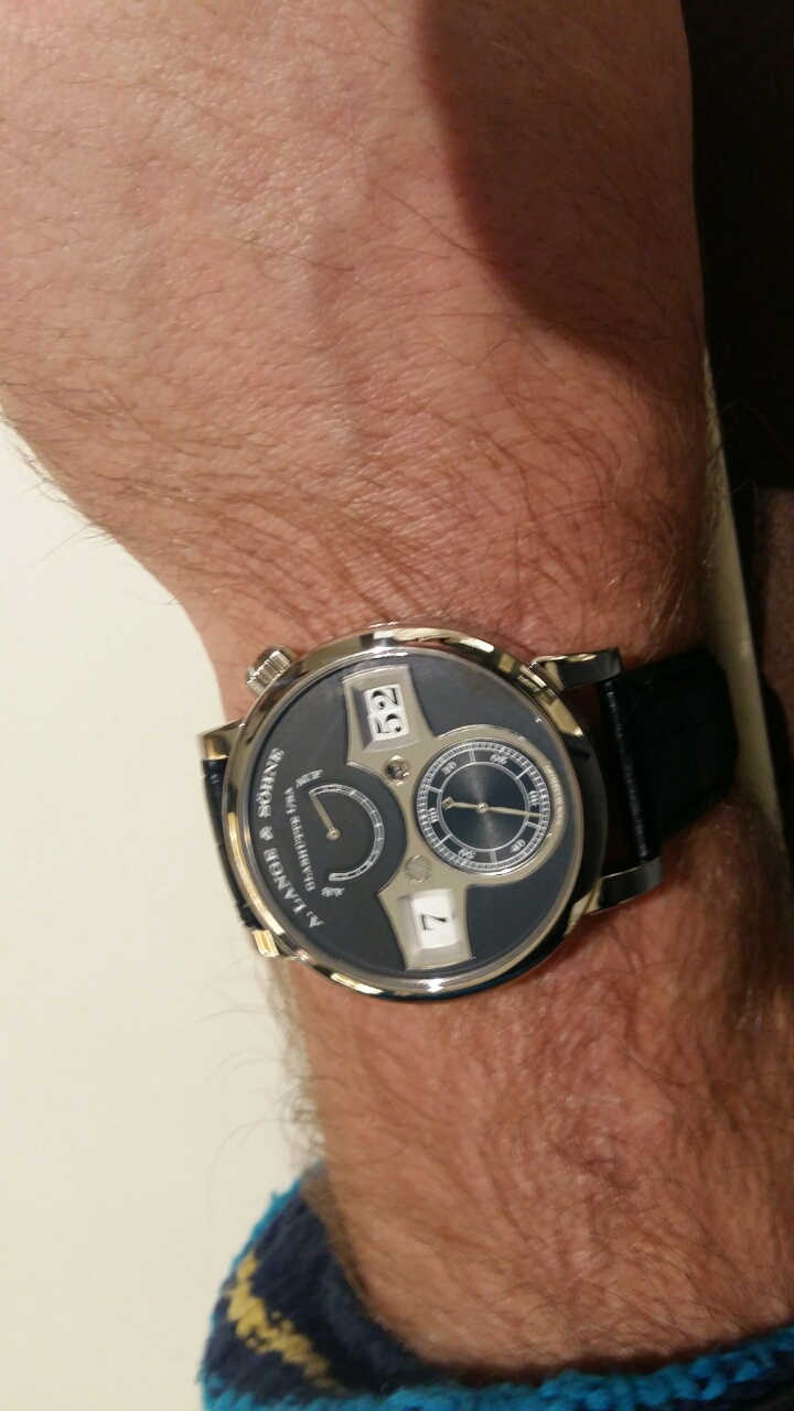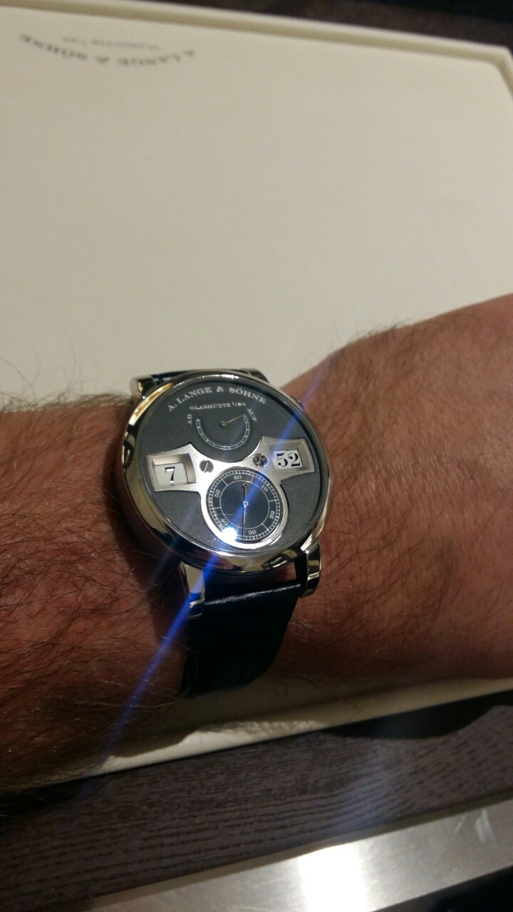 Намедни зашел в бутик A.LANGE & SOHNE. На удачу оказались в наличии после выставки, часы редкой модели A.LANGE & SOHNE ZEITWERK. Часы исполнены по модели знаменитых часов расположенных в опере немецкого города Дрезден, немцы очень гордятся этим оригинальным исполнением часов, ну конечно механизм значительно усложнен. Персонал любезно представил шедевр для примерки. К сожалению модель была в исполнении 41мм и по моему мнению маловата для моей длинной руки. Представляю на ваш взгляд оценить примерку.