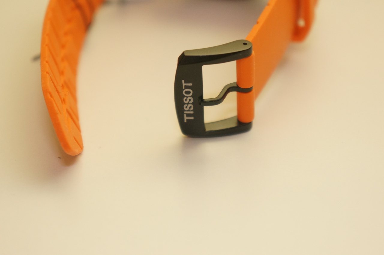 Модель TISSOT T081.420.97.057.02 Touch Collection T-Race Aluminium имеет устойчивое к царапинам сапфировое стекло, ремешок из натурального каучука оранжевого цвета, черный циферблат.